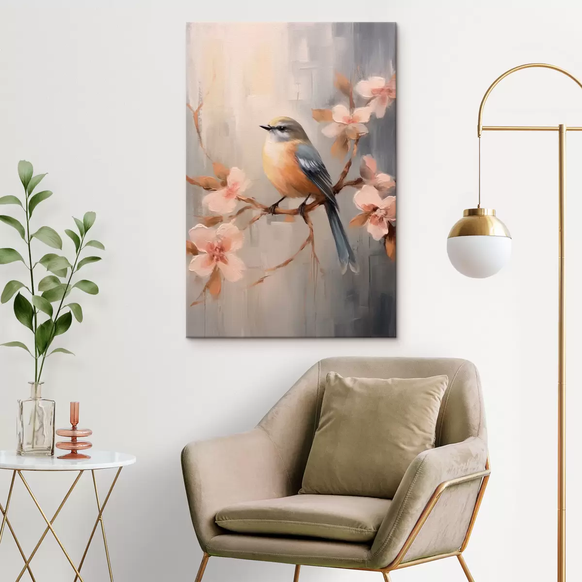 Paveikslas Paukštis ant šakos ir rožinės gėlės Nr s42302