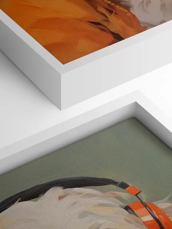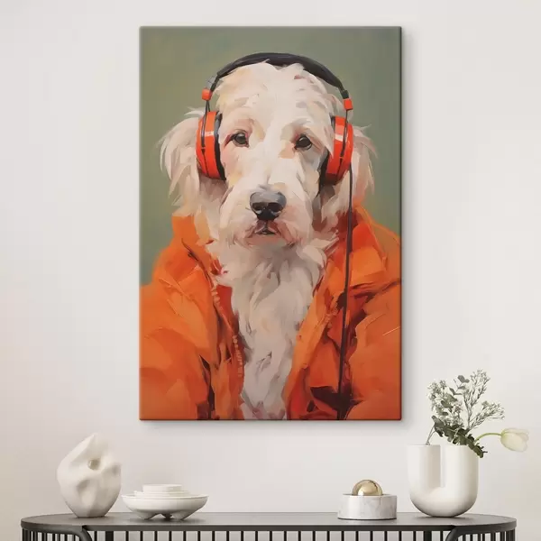 Paveikslas Baltas šuo su oranžiniu švarkeliu ir ausinėmis, imituojantis tapybą Nr s42364