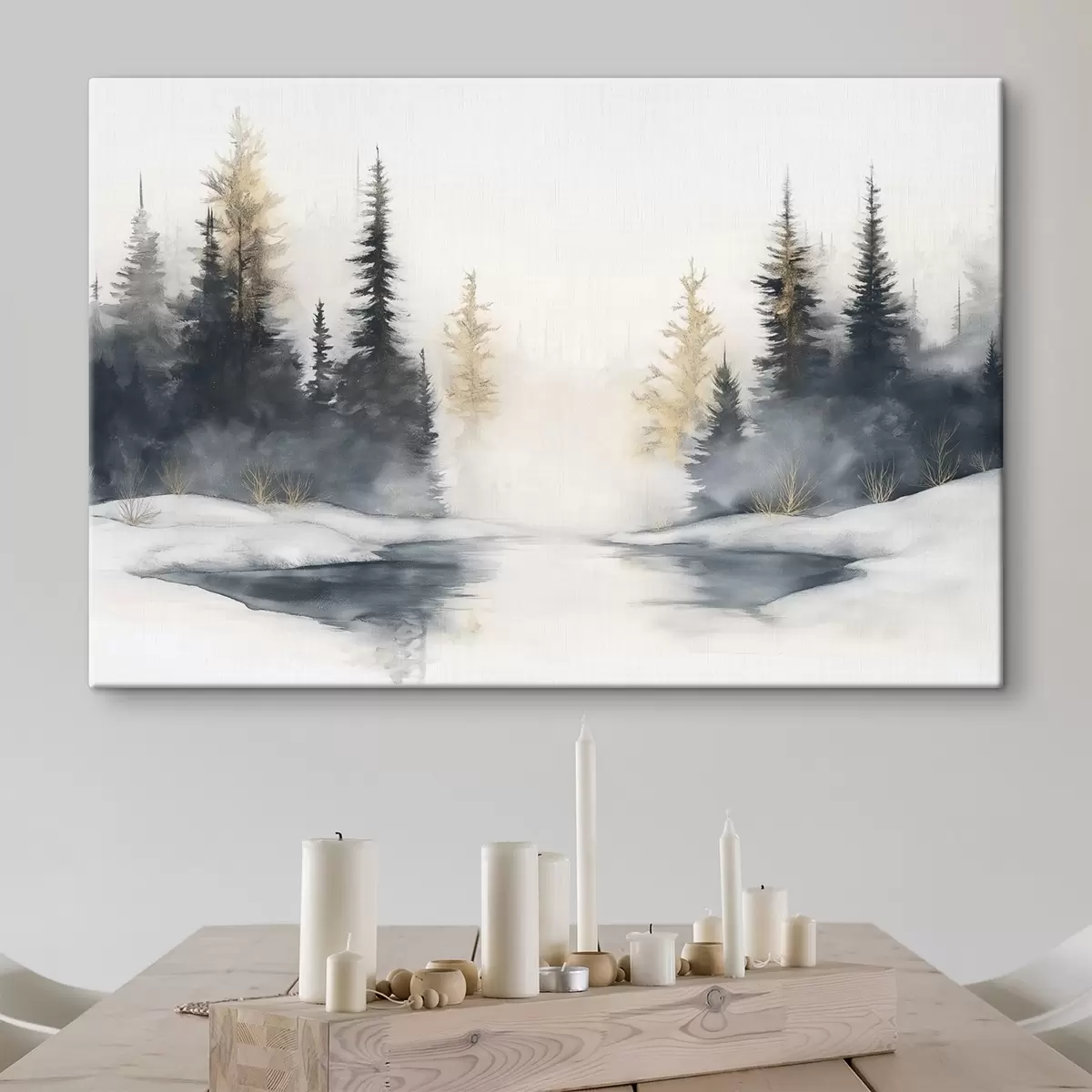 Paveikslas Žiemos kraštovaizdis su upe ir pušimis, gamta, miškas, rūkas Nr s42374