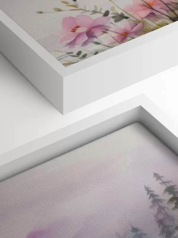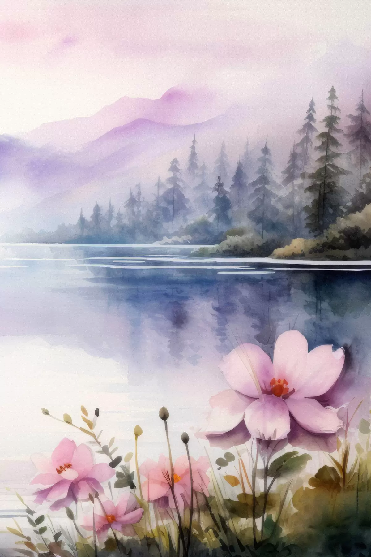 Paveikslas Rožinės gėlės kalnų ežero fone Nr s42393