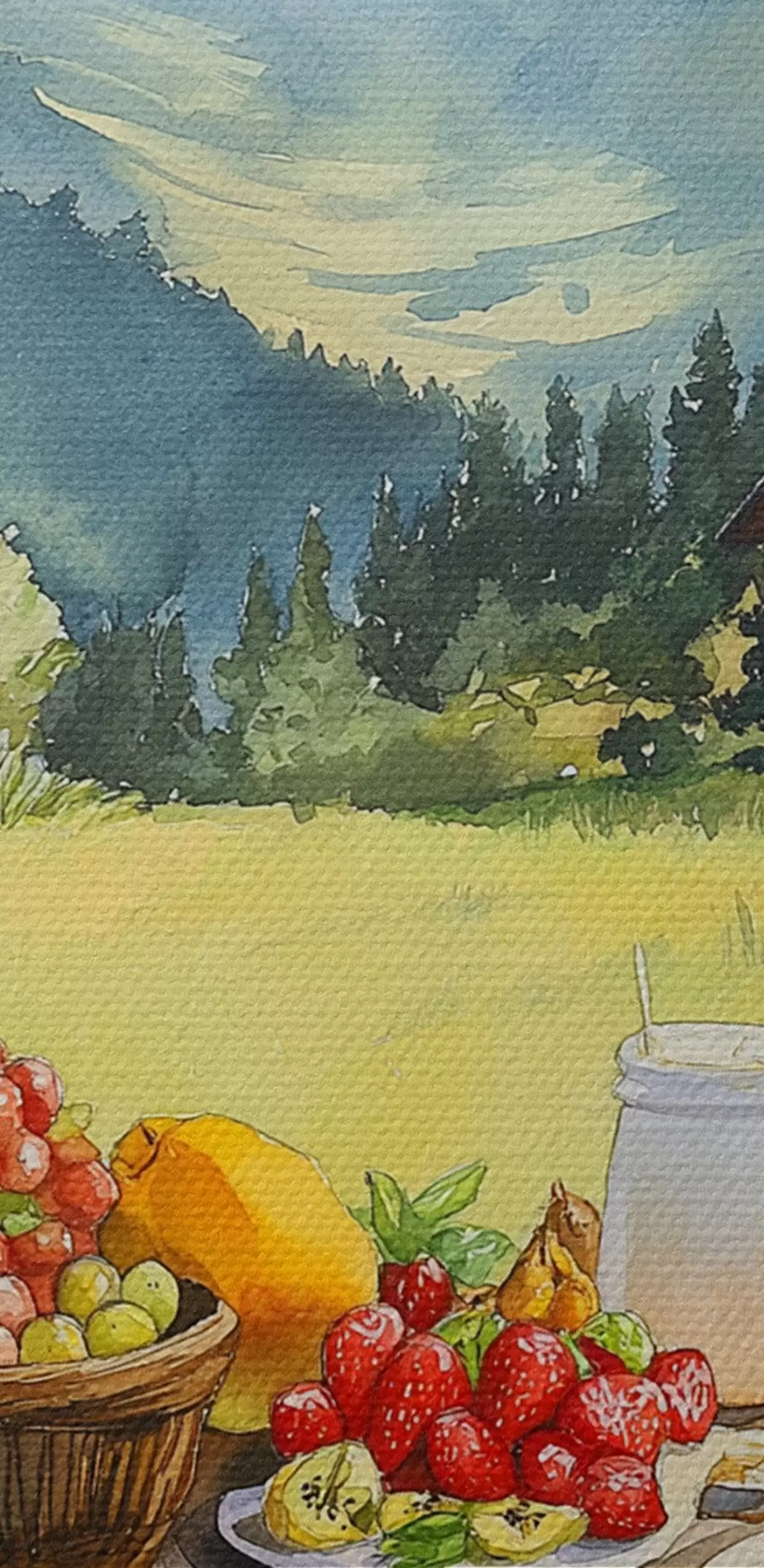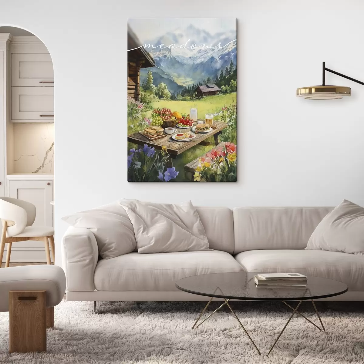 Paveikslas Kalnų kraštovaizdžiai, vasaros pieva, mediniai namai, pusryčiai Nr s42425