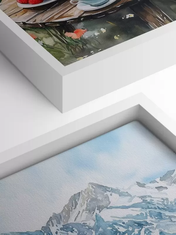 Paveikslas Gražūs vasaros peizažai su kalnais, mišku ir gėlėmis, pusryčiai, akvarelės stilius Nr s42427
