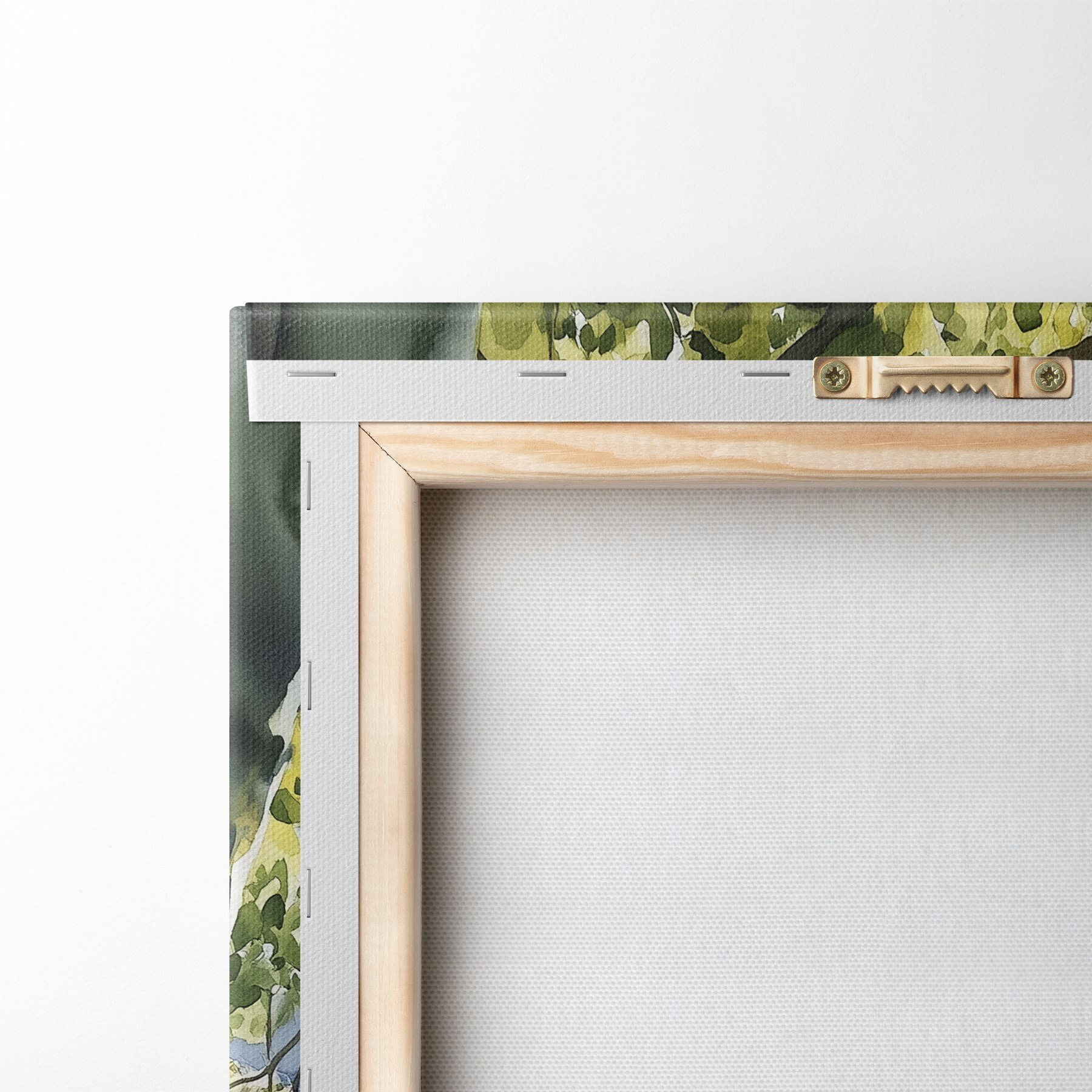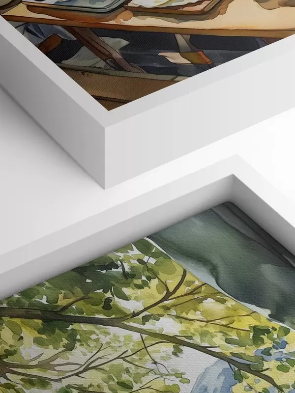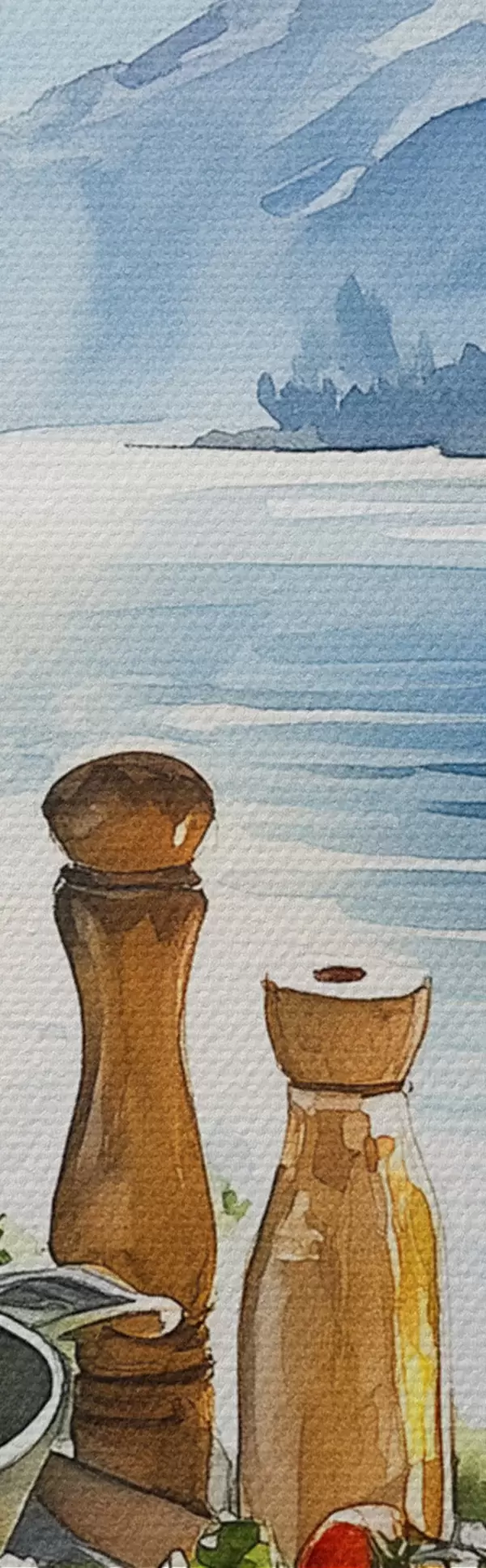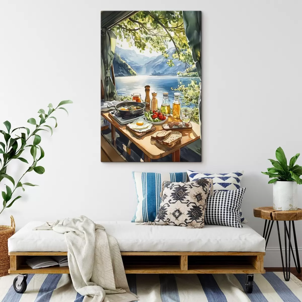 Paveikslas Gražus vasaros rytas, ežeras, akvarelės stilius, pusryčiai, kelionės Nr s42433