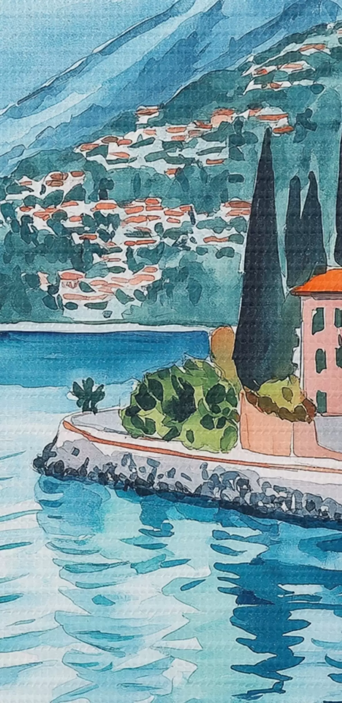 Paveikslas Komo ežeras, Italija, akvarelės stilius, pica, kokteiliai, senamiestis, kalnai Nr s42437