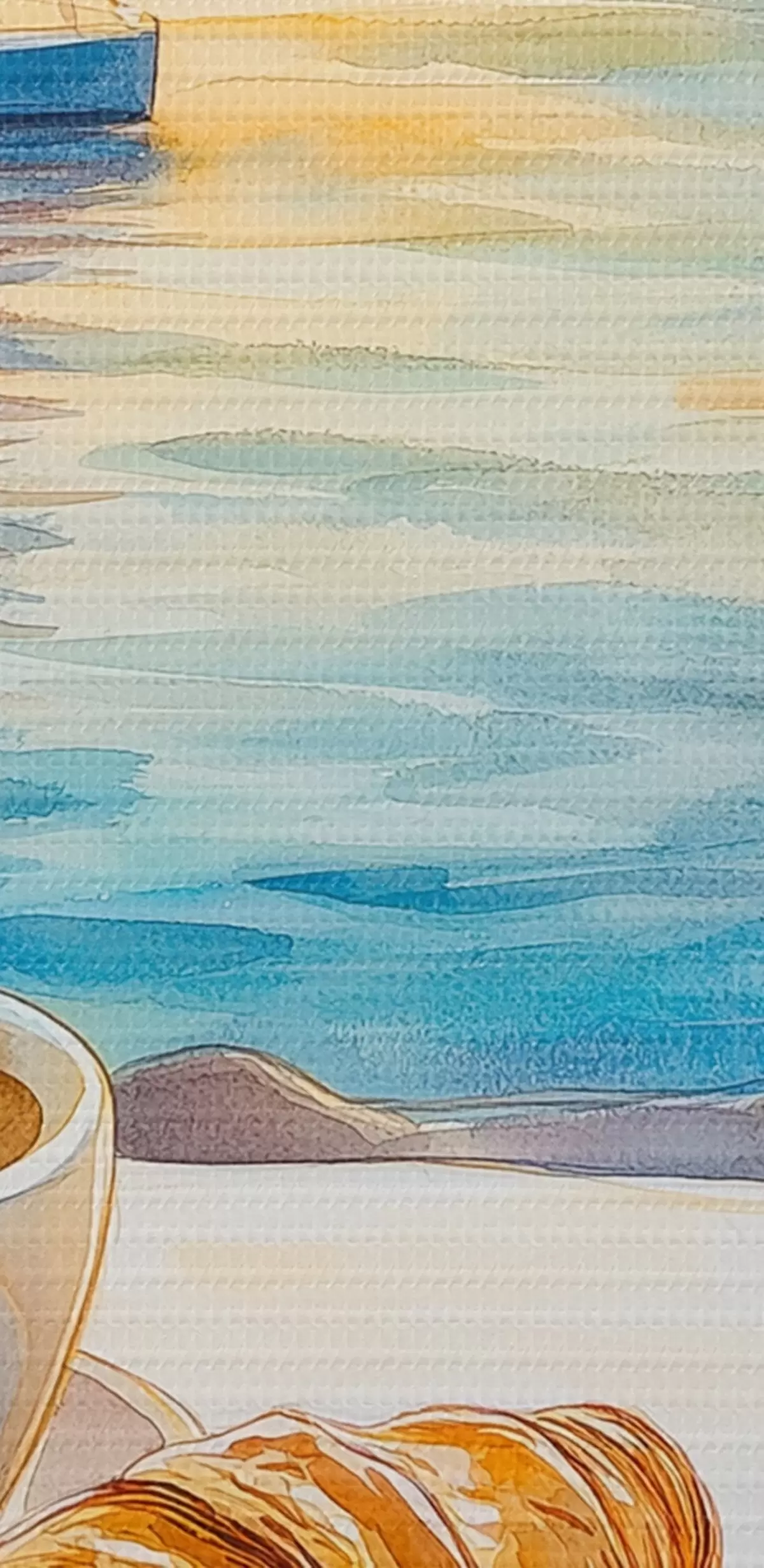Paveikslas Du puodeliai kapučino, akvarelės stilius, jūros saulėlydis, burlaiviai, pašaukimas Nr s42438