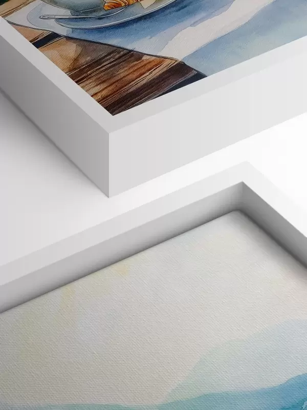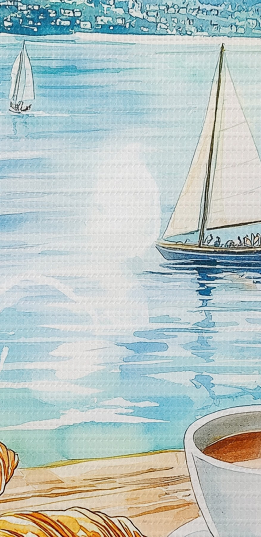 Paveikslas Vasaros ežeras su burlaiviais, kavos puodeliai, kruasanai, akvarelės stilius Nr s42441