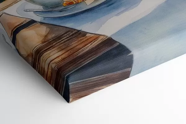 Paveikslas Vasaros ežeras su burlaiviais, kavos puodeliai, kruasanai, akvarelės stilius Nr s42441