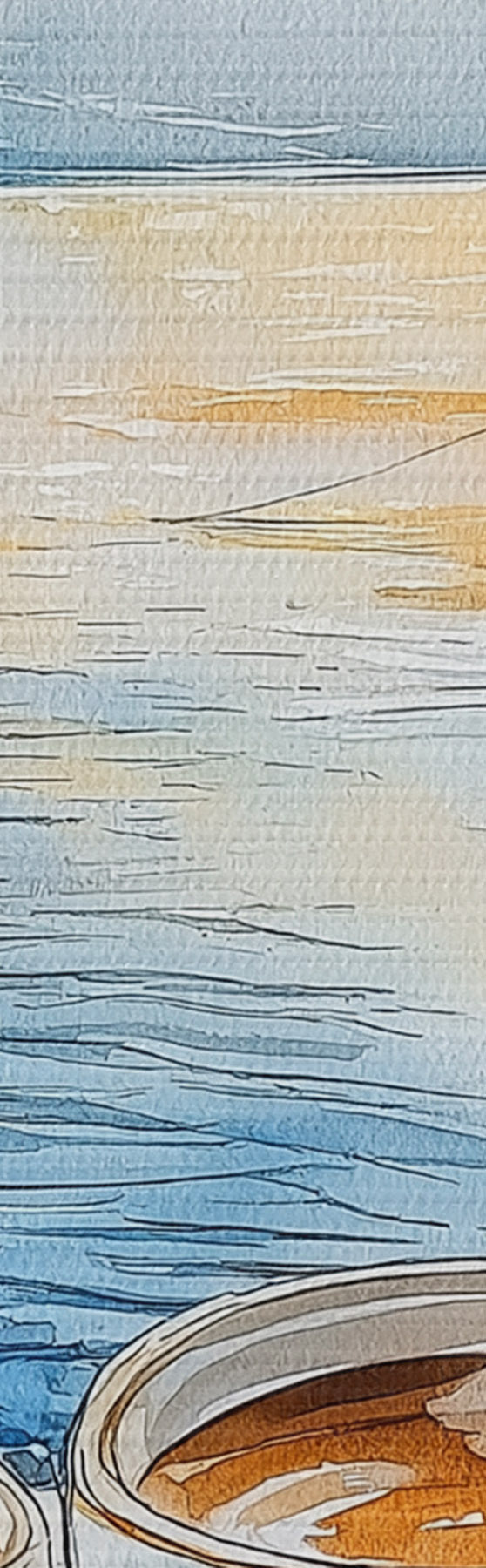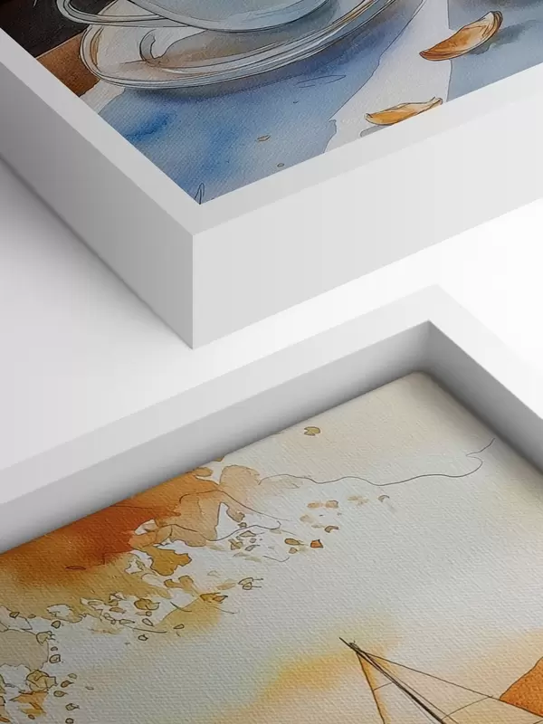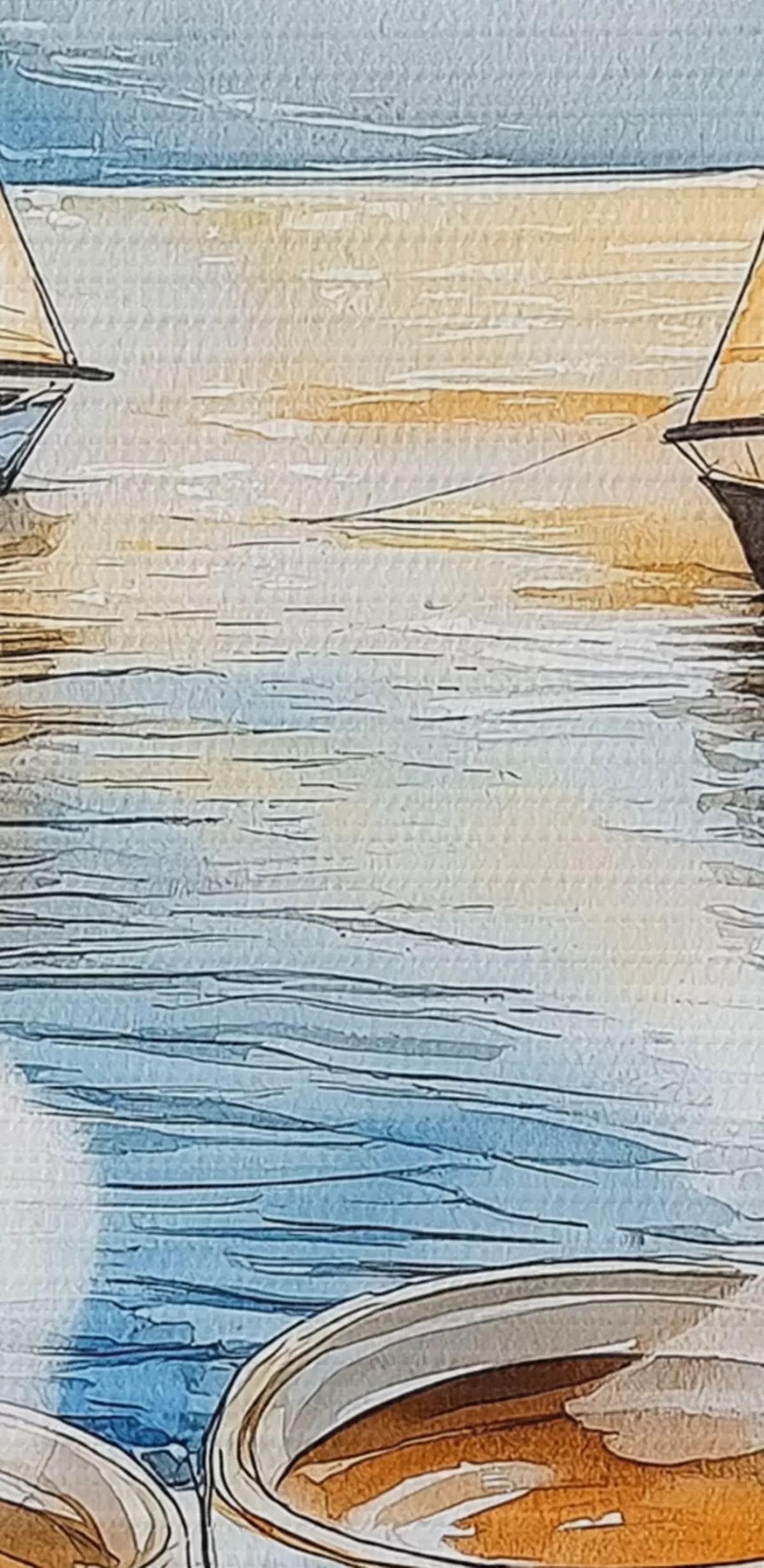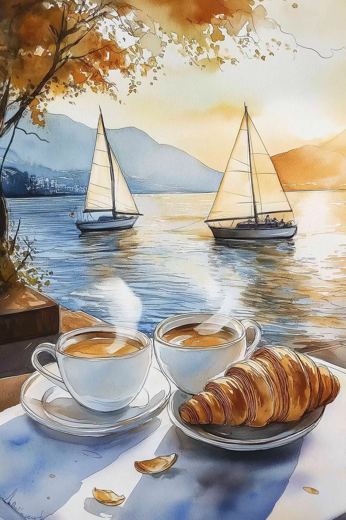 Paveikslas Saulėlydis ežere, burlaiviai, kavos puodeliai, akvarelės stilius Nr s42442