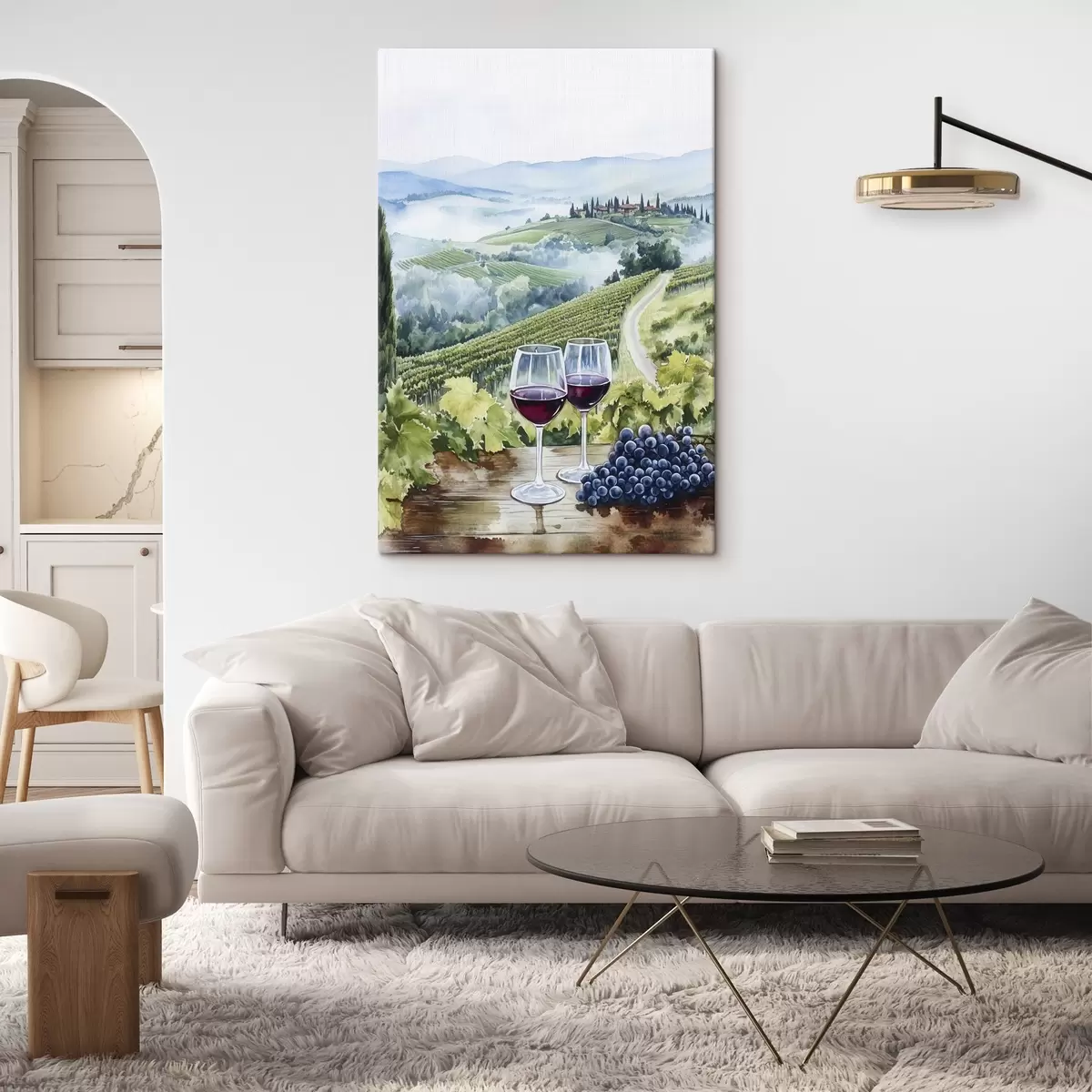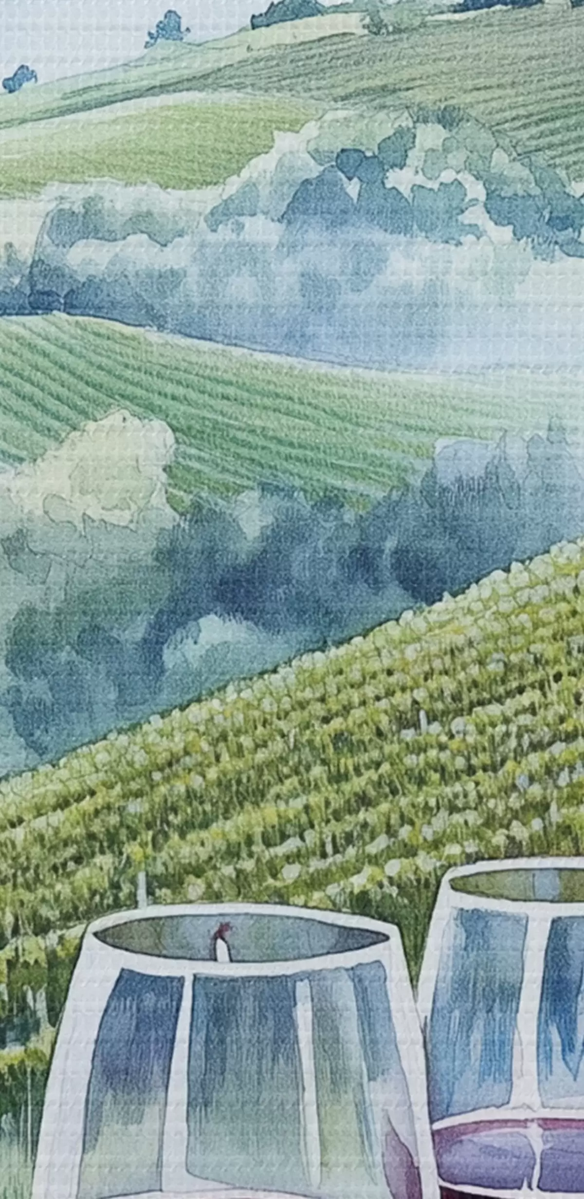 Paveikslas Toskanos kraštovaizdis, vynuogių kiemai, vyno taurės, akvarelės stilius Nr s42445