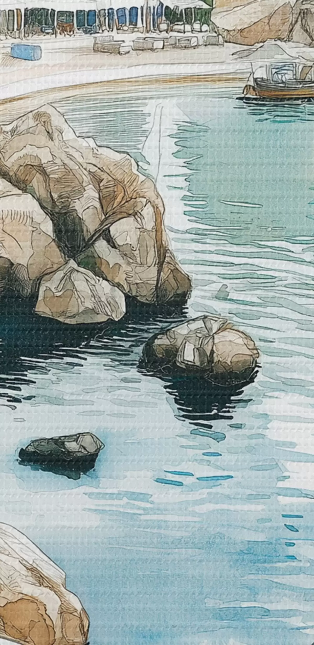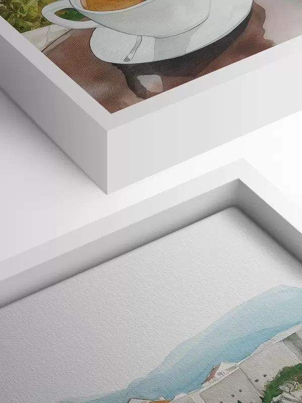 Paveikslas Kavos puodeliai prie jūros, akvarelės stilius, Kroatija Nr s42448