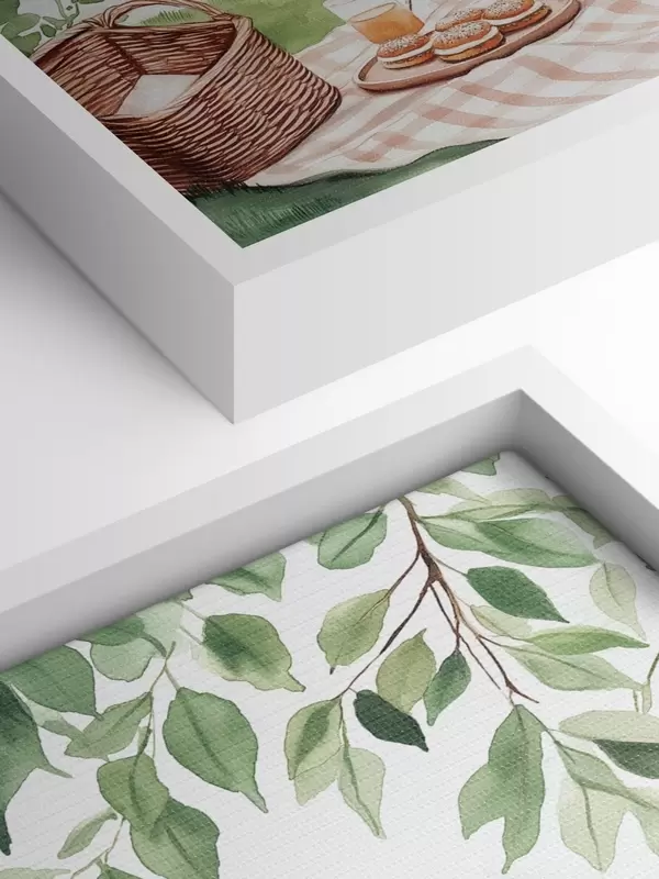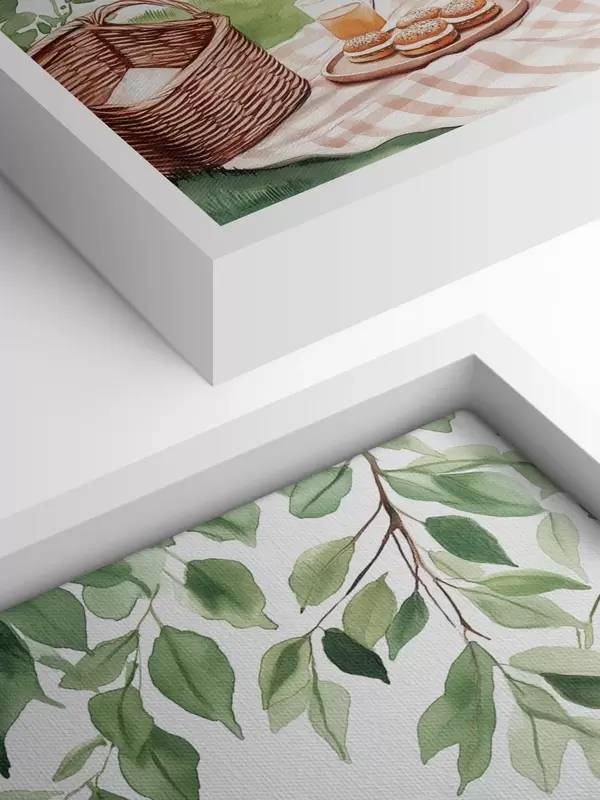 Paveikslas Akvarelės stiliaus vasaros piknikas, kaimiškas, ežeras, žaluma, maisto krepšeliai Nr s42452