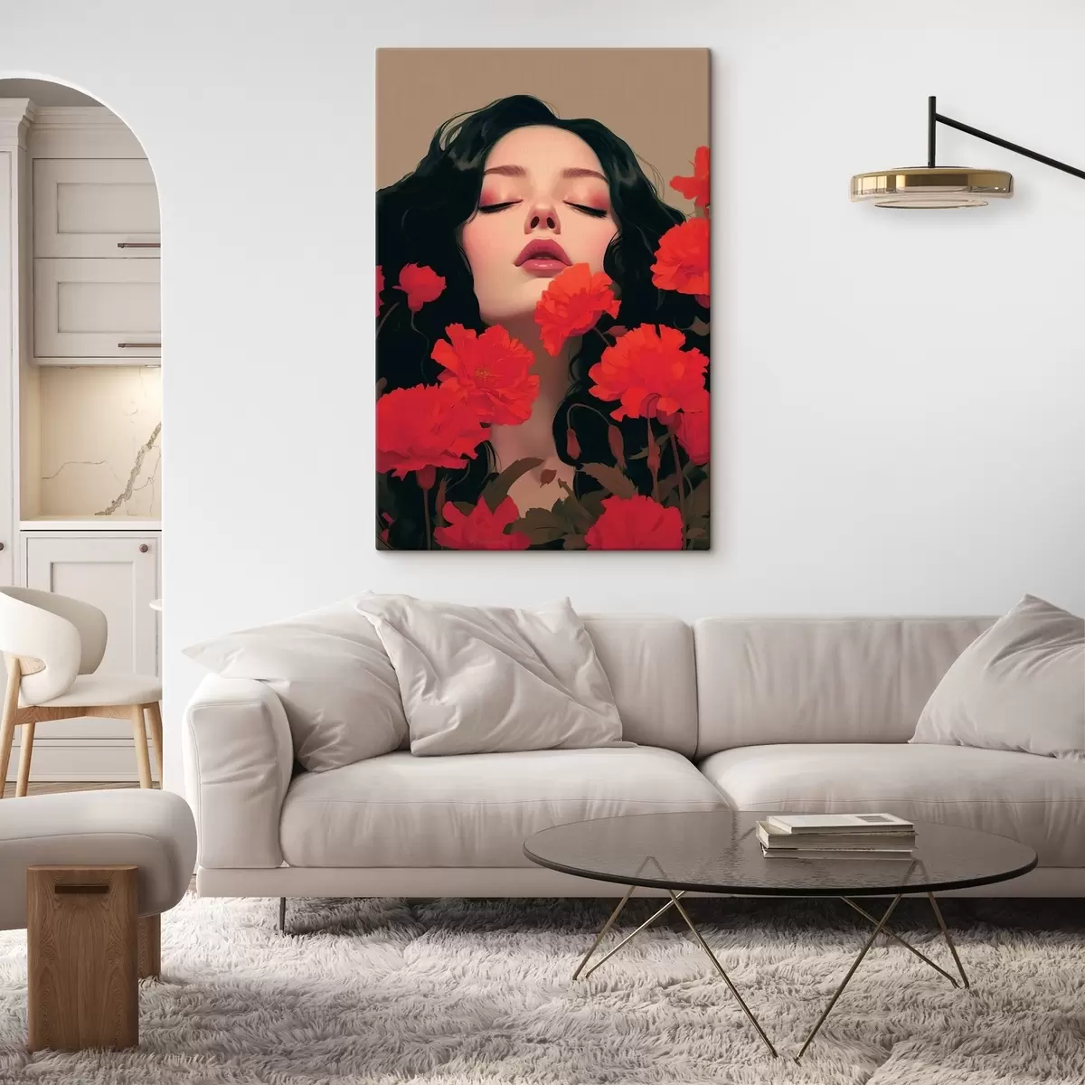 Paveikslas Moters portretas tarp raudonų gėlių Nr s42478