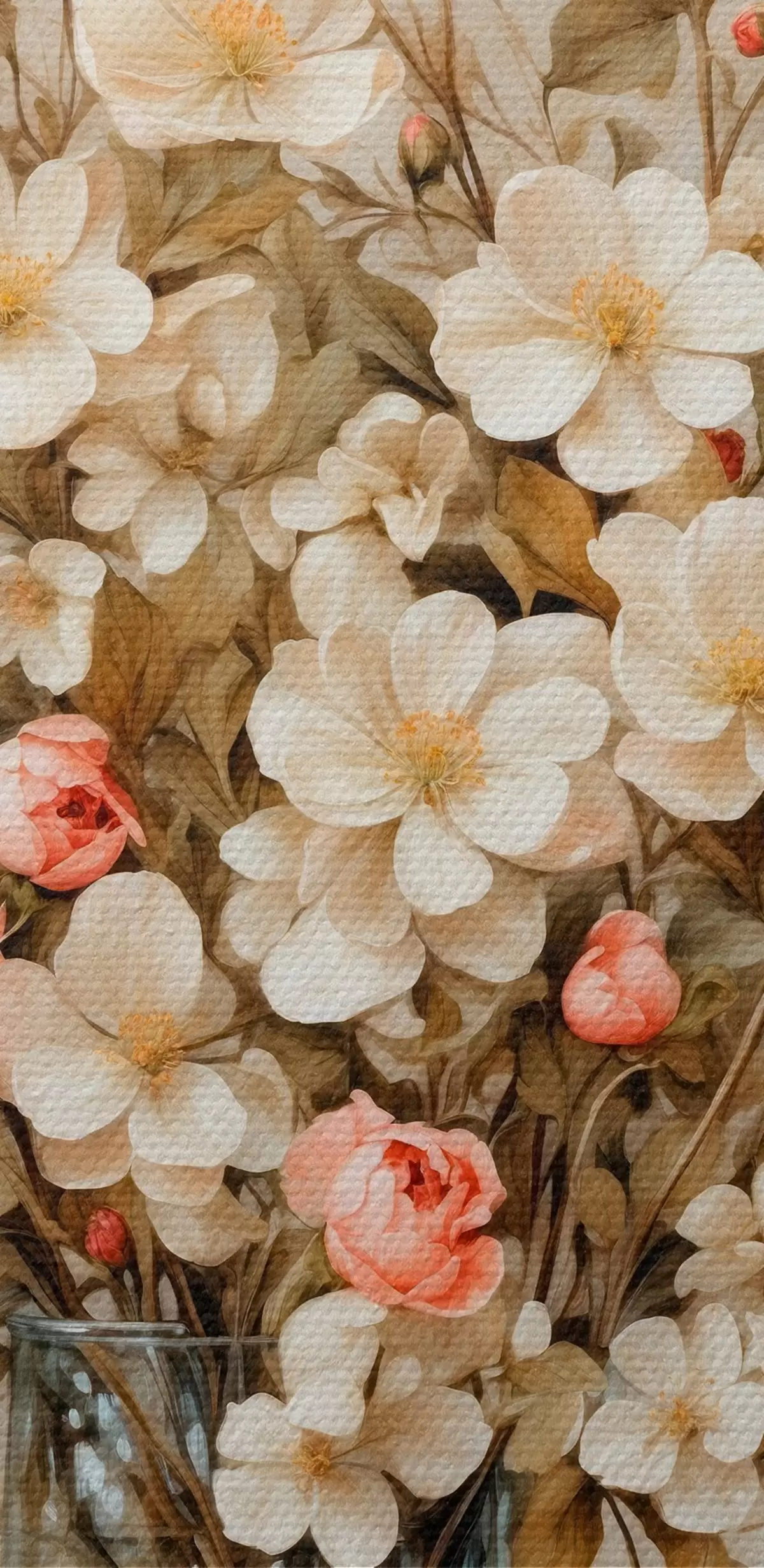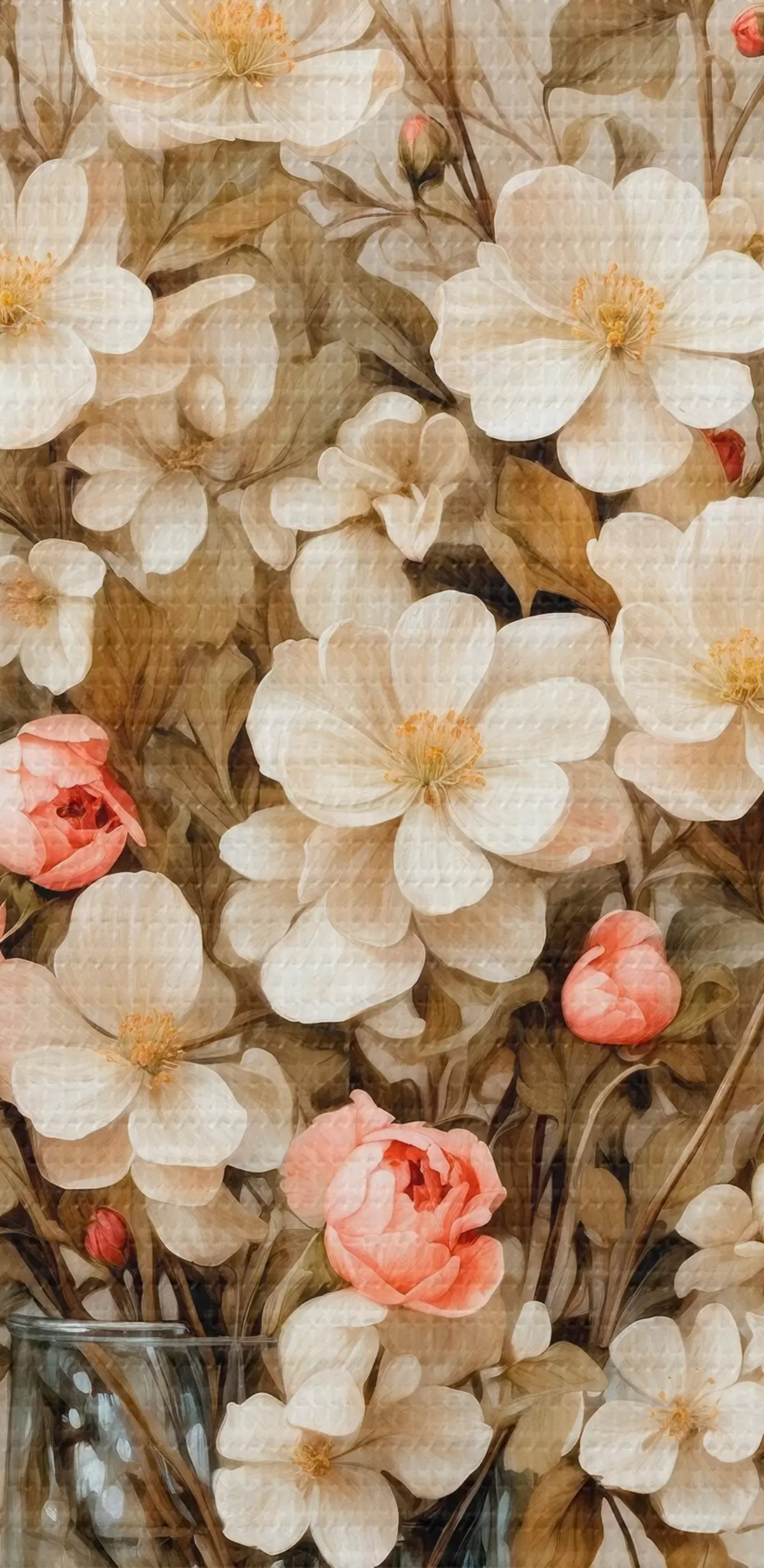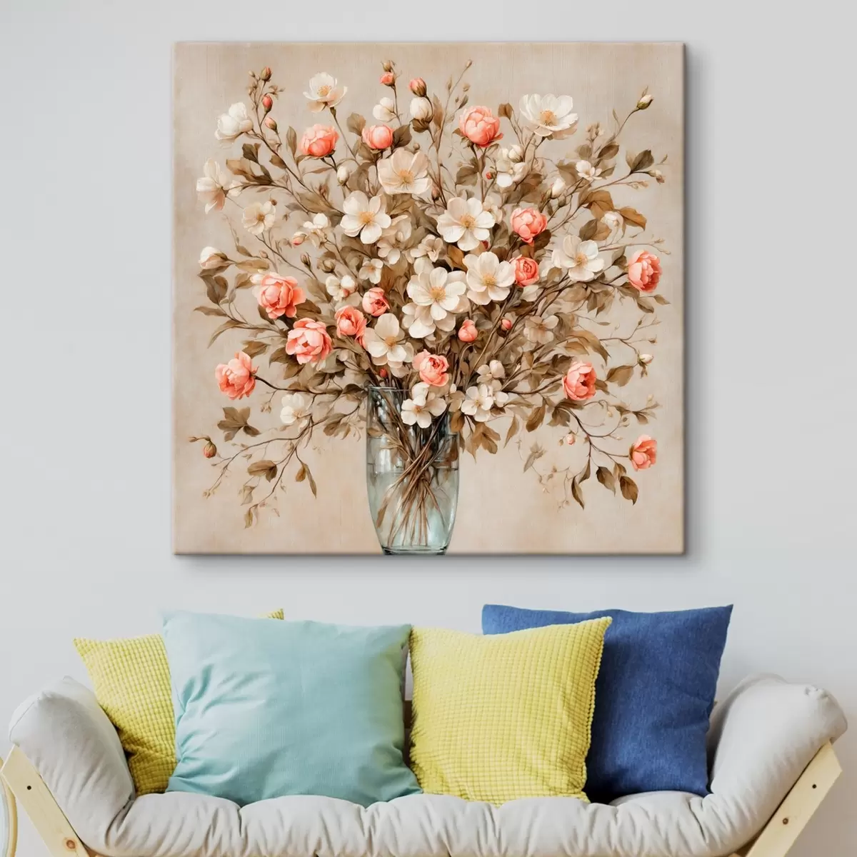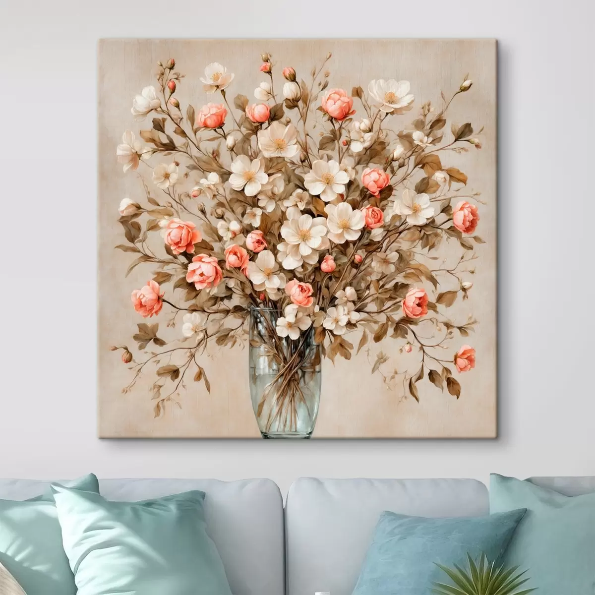 Paveikslas Gėlės skaidrioje vazoje smėlio spalvos fone Nr s42534