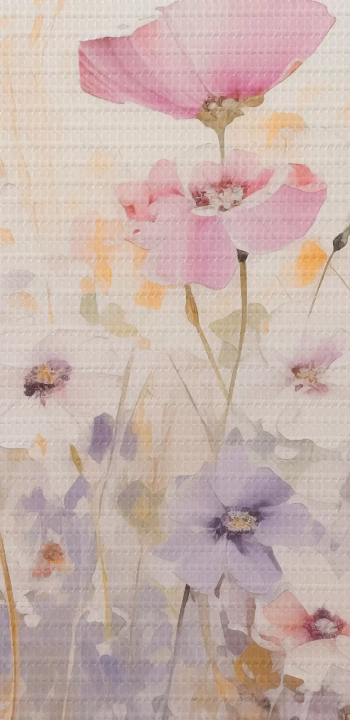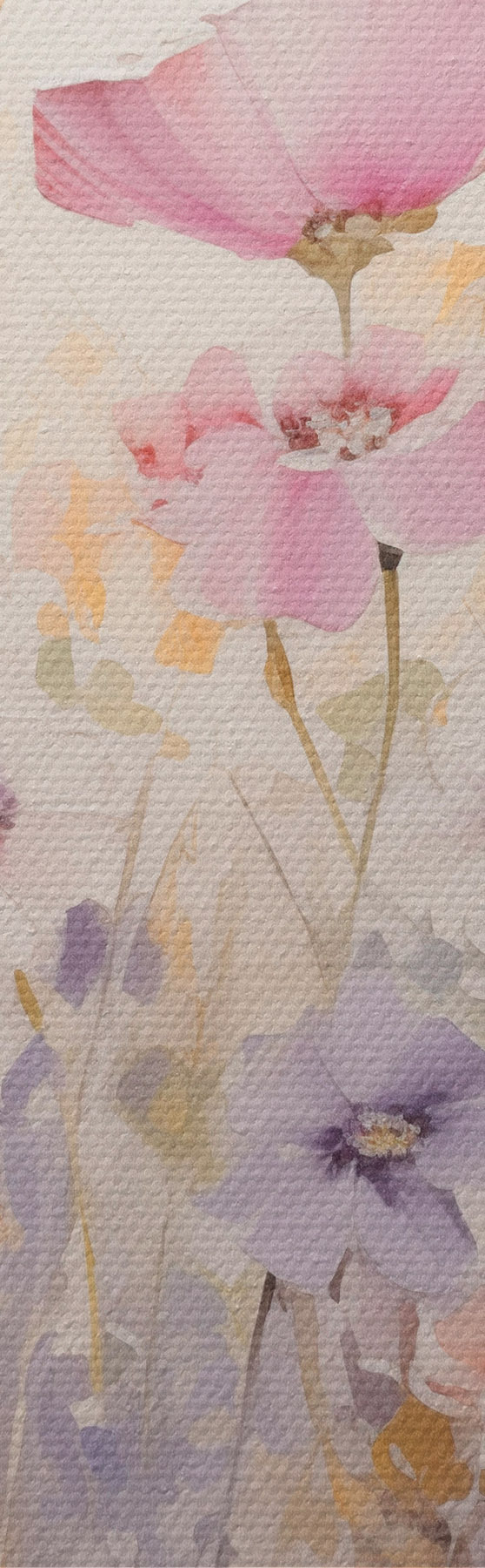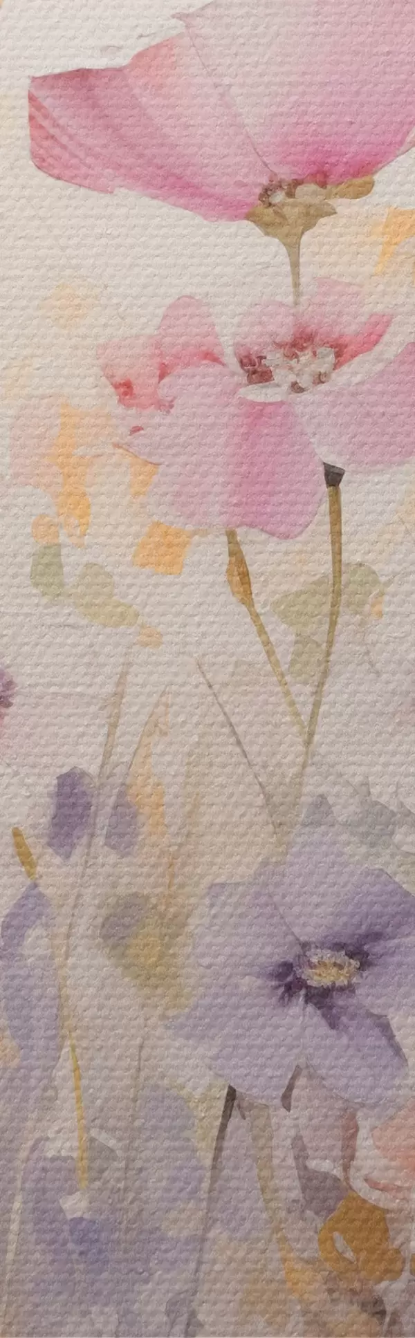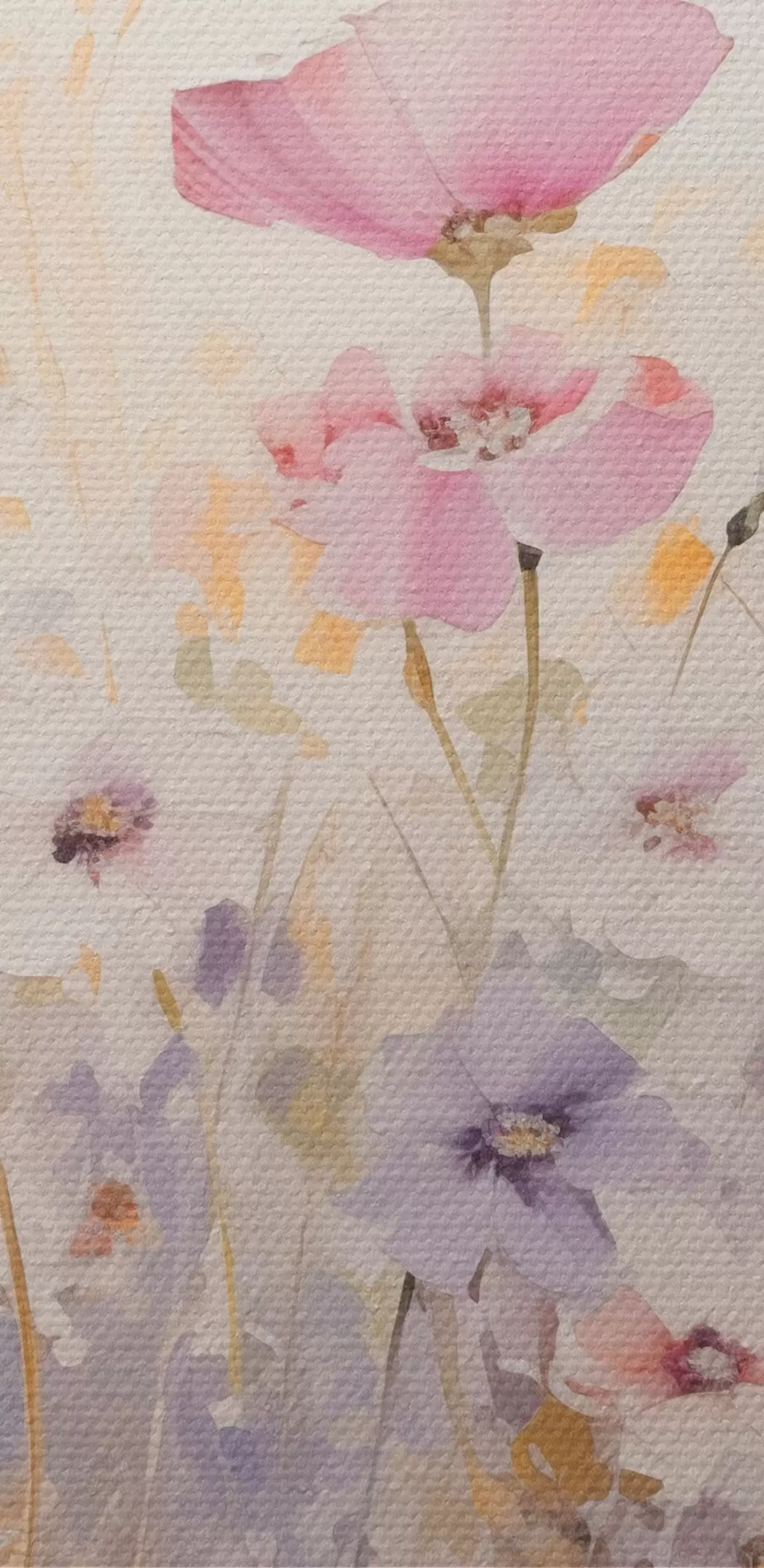 Paveikslas Pieva su akvarelinėmis švelnių rožinių, violetinių ir baltų atspalvių gėlėmis, kuriančiomis lengvumo ir harmonijos atmosferą. Nr s42557