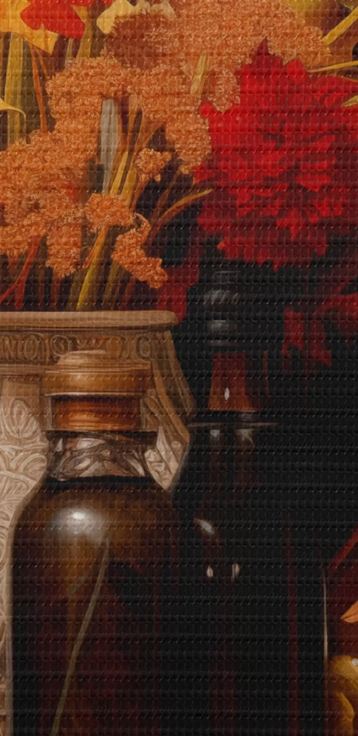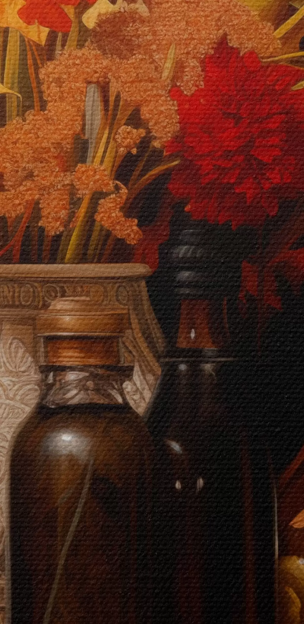 Paveikslas Rudeninis natiurmortas su šiltų oranžinių ir raudonų tonų puokšte, obuoliais, vynuogėmis, knygomis ir keramikiniais indais tamsiame fone. Nr s42561