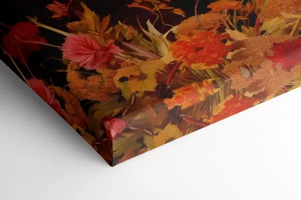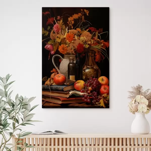 Paveikslas Rudeninis natiurmortas su šiltų oranžinių ir raudonų tonų puokšte, obuoliais, vynuogėmis, knygomis ir keramikiniais indais tamsiame fone Nr s42561