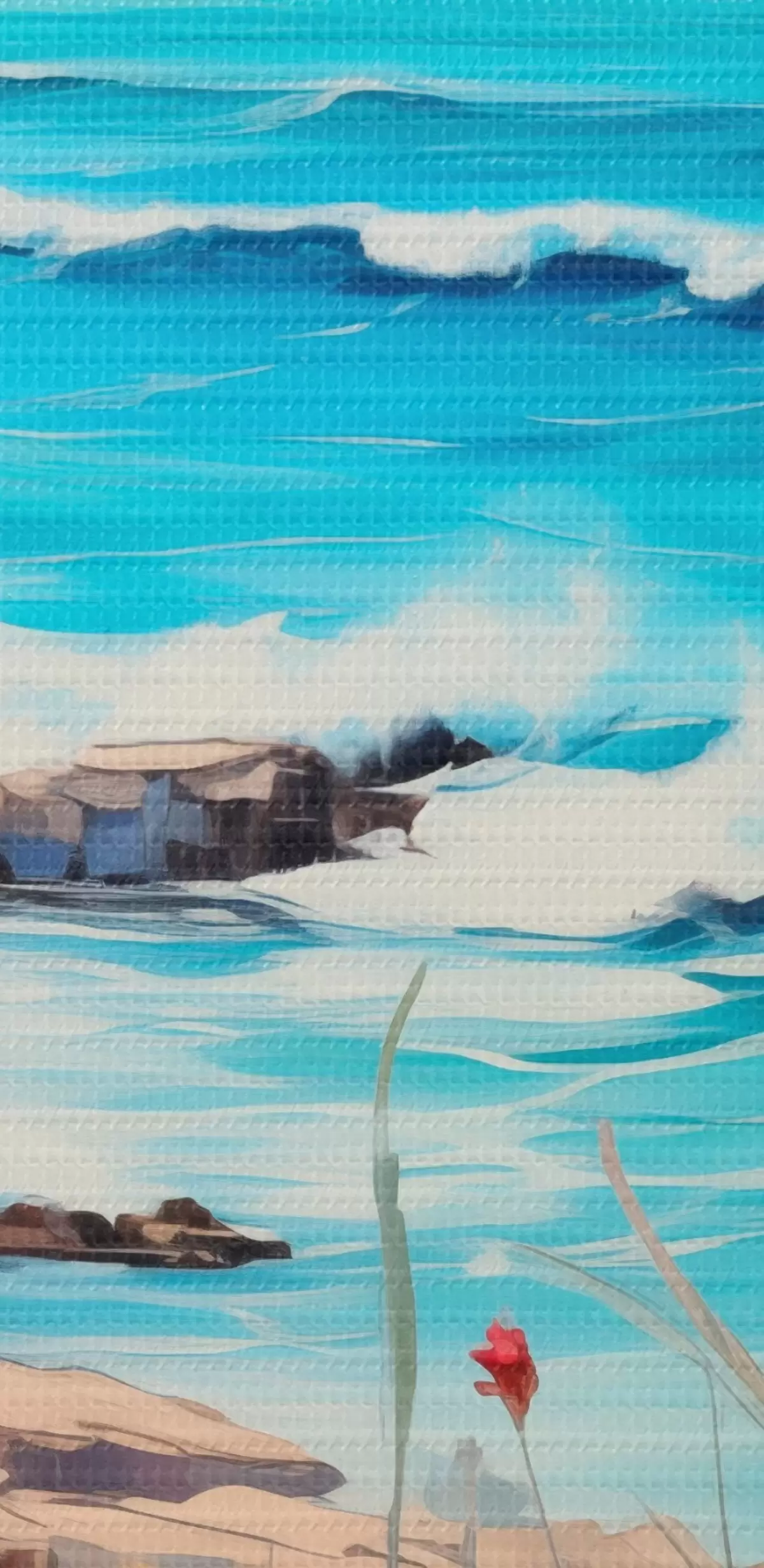 Paveikslas Jūros peizažas su turkio spalvos bangomis, uolėtu krantu ir ryškiomis gėlėmis pirmame plane po žydru dangumi. Nr s42568