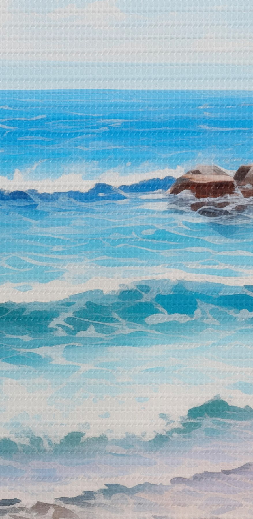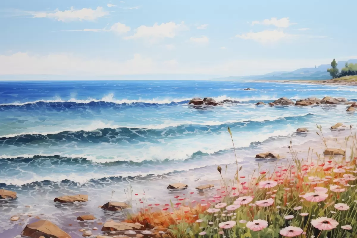 Paveikslas Pajūrio vaizdas su turkio spalvos bangomis, žvirgždėtu paplūdimiu ir švelniomis rausvomis gėlėmis pirmame plane po šviesiu dangumi. Nr s42569
