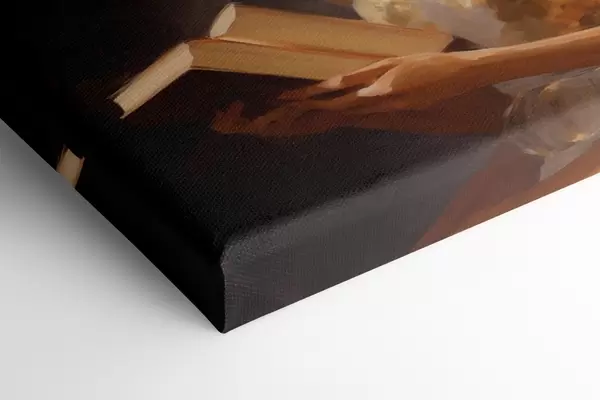 Paveikslas Elegantiška suknele vilkinti jauna moteris skaito knygą atmosferiniame apšvietime, apsupta knygų lentynų ir švelnaus žvakių švytėjimo. Nr s42570