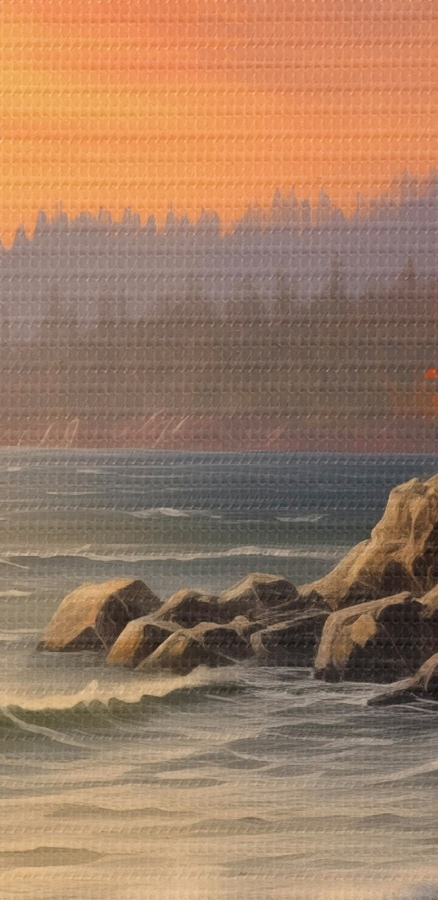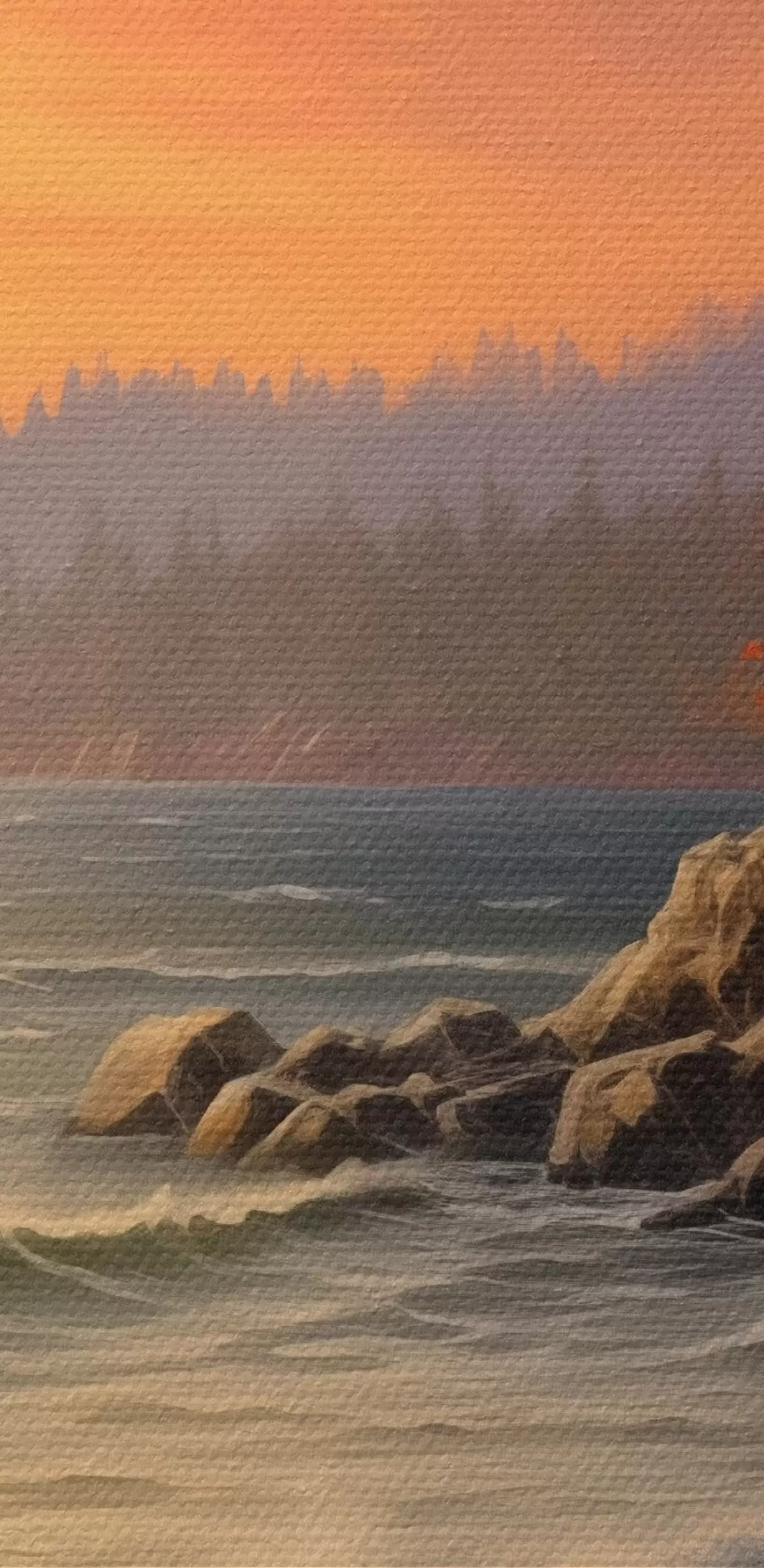 Paveikslas Saulėlydis virš pajūrio su bangomis, pušynu ir rudens spalvomis pirmame plane. Nr s42571