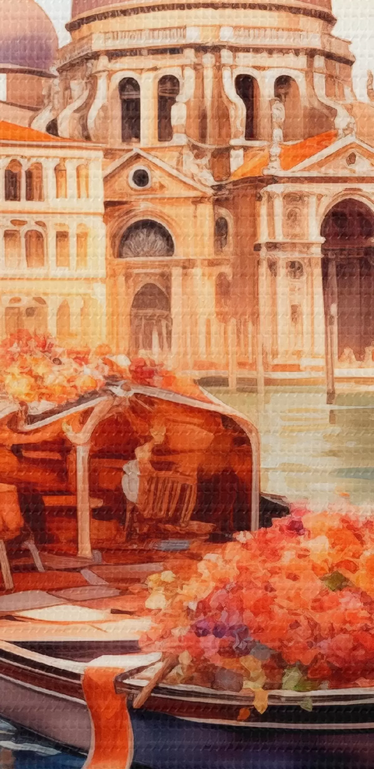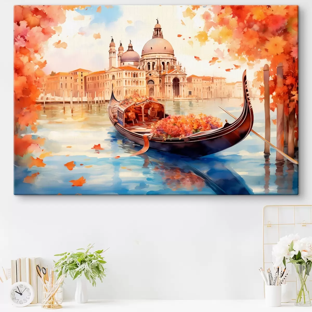 Paveikslas Rudeninis Venecijos vaizdas su gondola, apsupta ryškiai oranžinių ir raudonų lapų, su pastatų atspindžiais ramiame kanalo vandenyje. Nr s42576