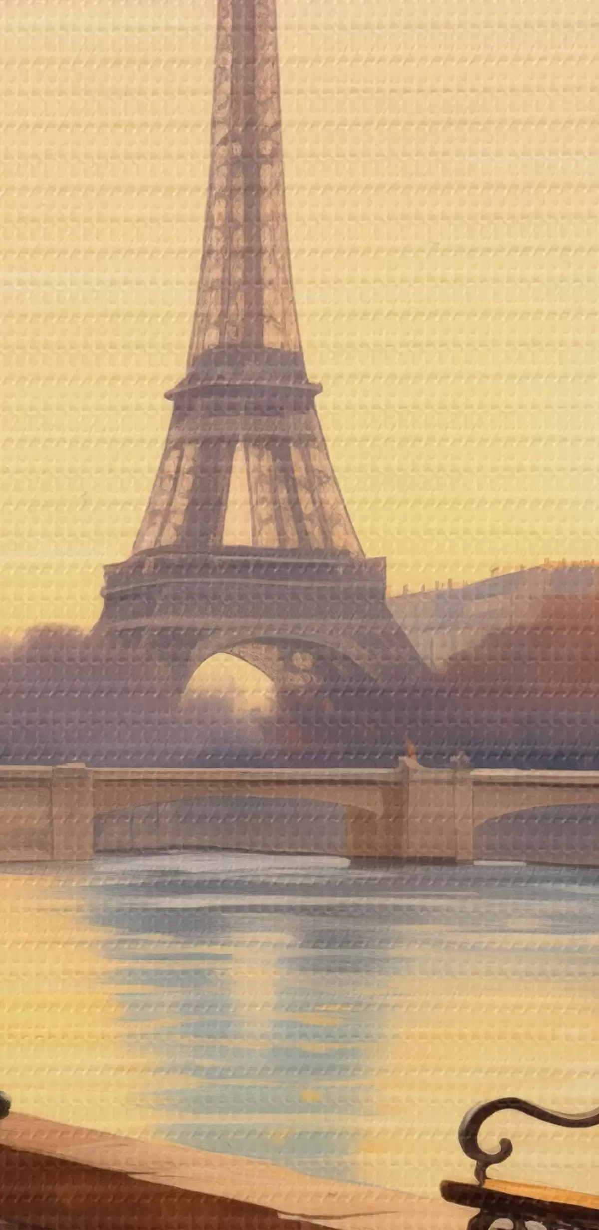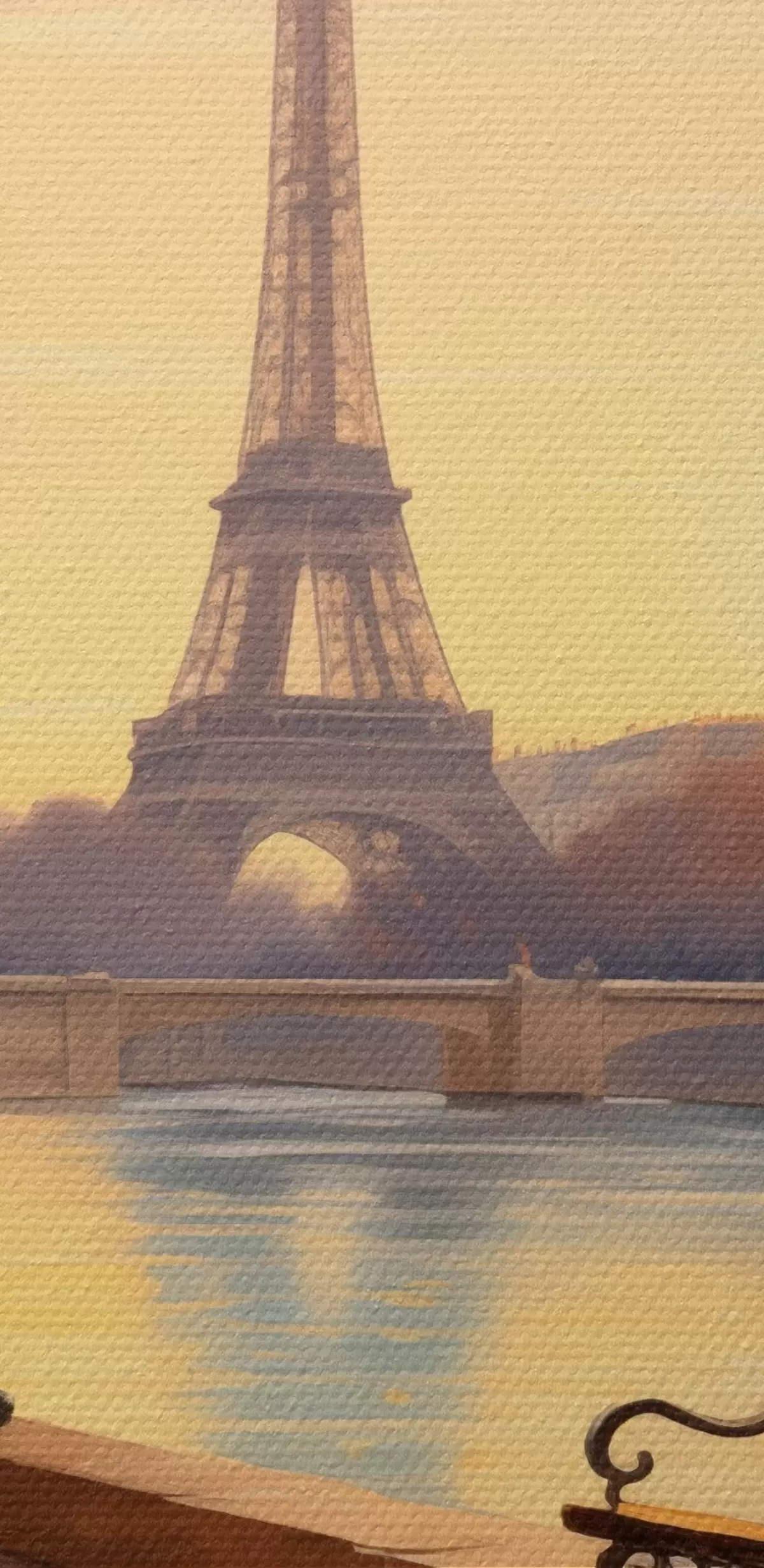 Paveikslas Ruduo Paryžiuje su vaizdu į Eifelio bokštą, Senos krantais, padengtais lapais, suoliukais ir gatvių žibintais, kurie prisideda prie romantiškos atmosferos. Nr s42577