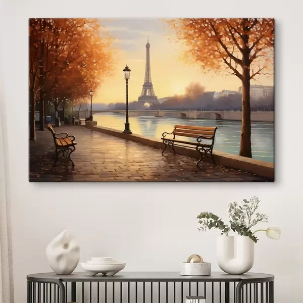 Paveikslas Ruduo Paryžiuje su vaizdu į Eifelio bokštą, Senos krantais, padengtais lapais, suoliukais ir gatvių žibintais, kurie prisideda prie romantiškos atmosferos Nr s42577