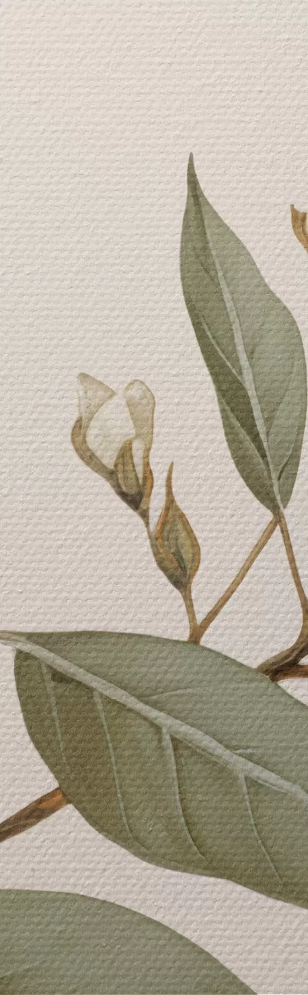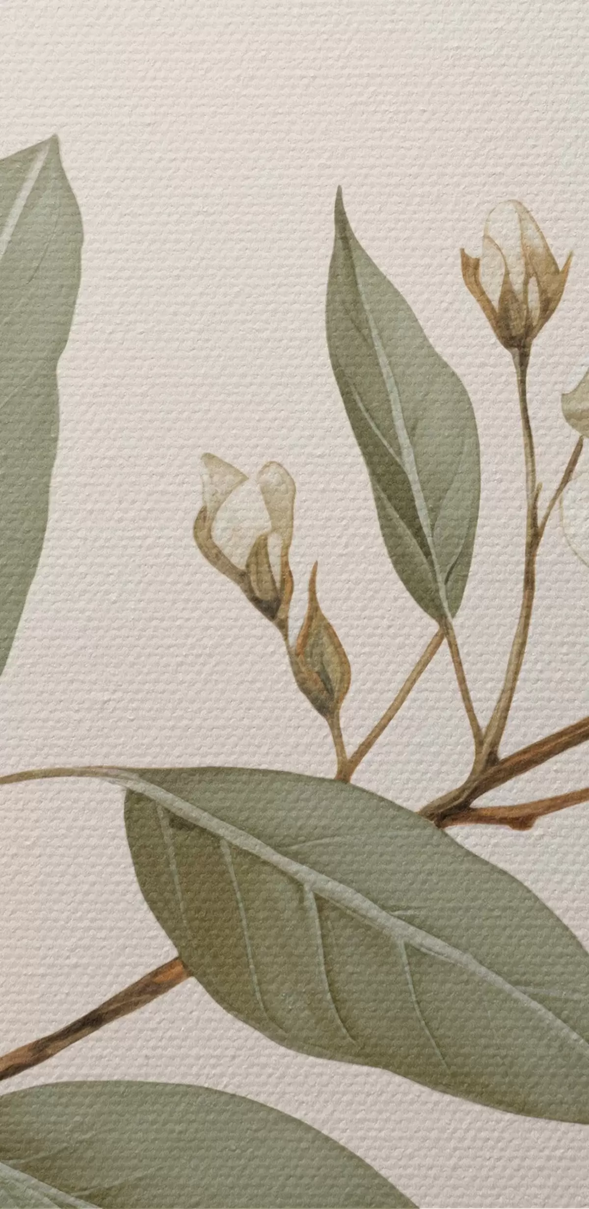 Paveikslas Švelni šakelė su baltomis gėlėmis ir žaliais lapais šviesiame fone, su švelniomis detalėmis ir elegantišku stiliumi. Nr s42583