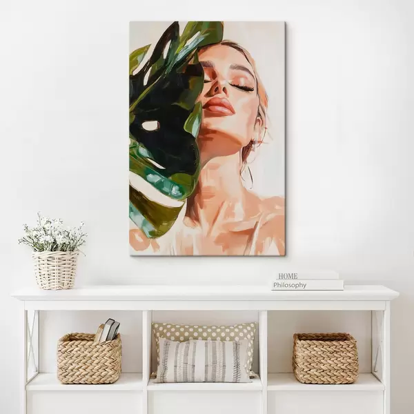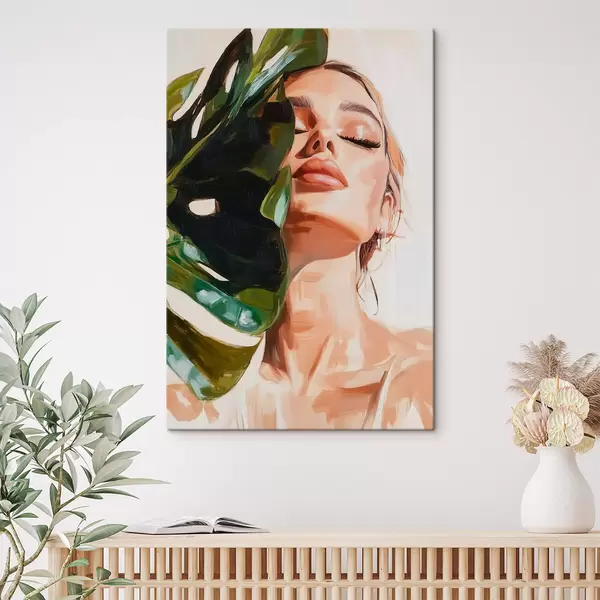 Paveikslas Moters su monsteros lapu portretas su teptuko potėpių imitacija Nr s42597
