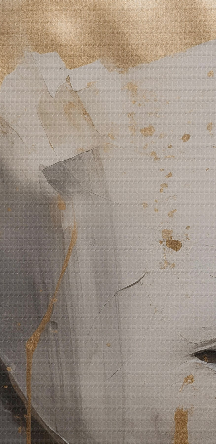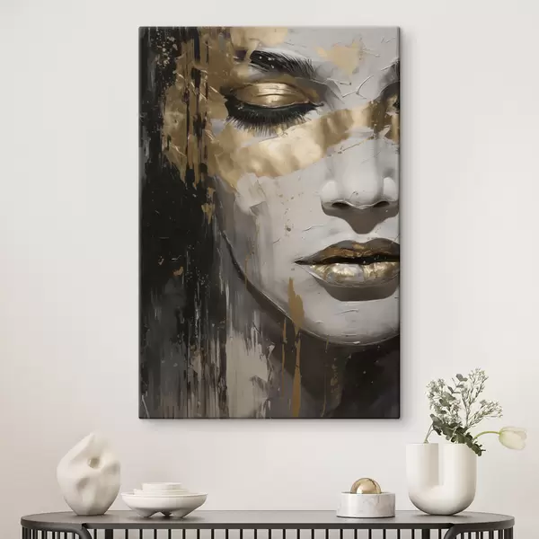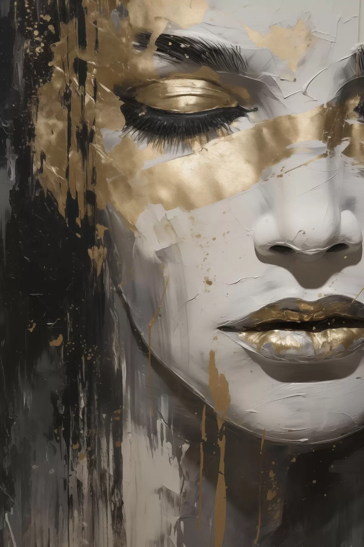 Paveikslas Abstraktus moters portretas, kuriame pabrėžiamos užmerktos akys ir lūpos, nutapytas juodai baltais atspalviais su dinamiškais šiltų spalvų potėpiais. Nr s42626