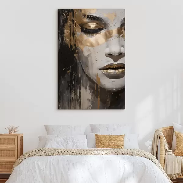 Paveikslas Abstraktus moters portretas, kuriame pabrėžiamos užmerktos akys ir lūpos, nutapytas juodai baltais atspalviais su dinamiškais šiltų spalvų potėpiais. Nr s42626