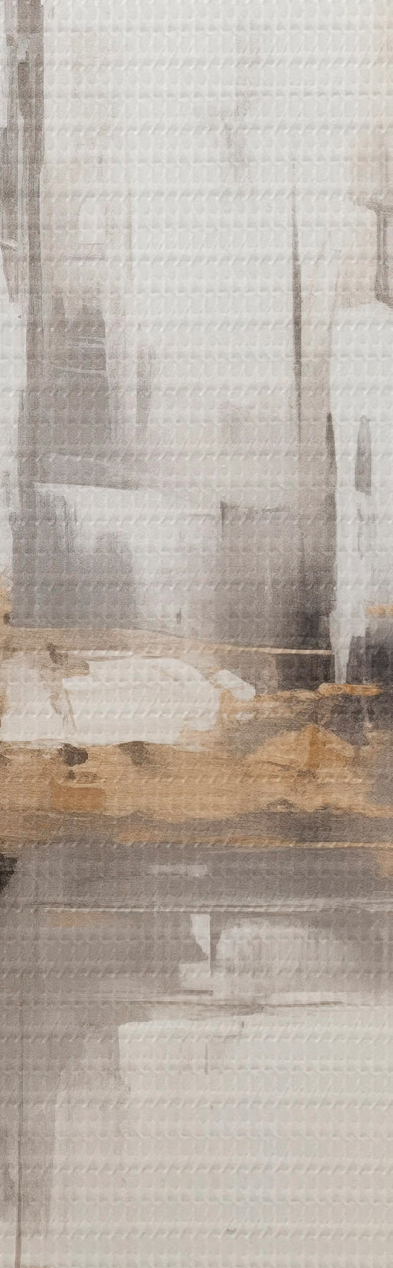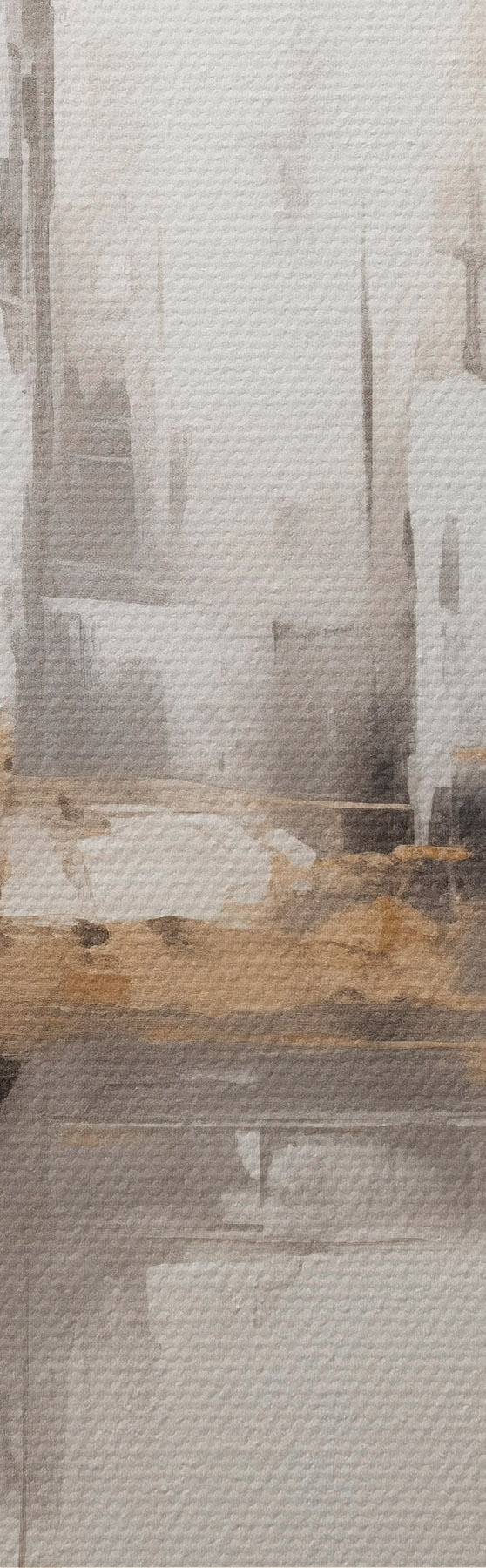 Paveikslas Abstraktus miesto peizažas su pastatų atspindžiais vandenyje, sukurtas neutraliais tonais su šiltų atspalvių akcentais. Nr s42628