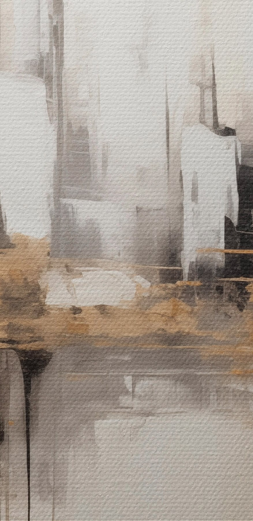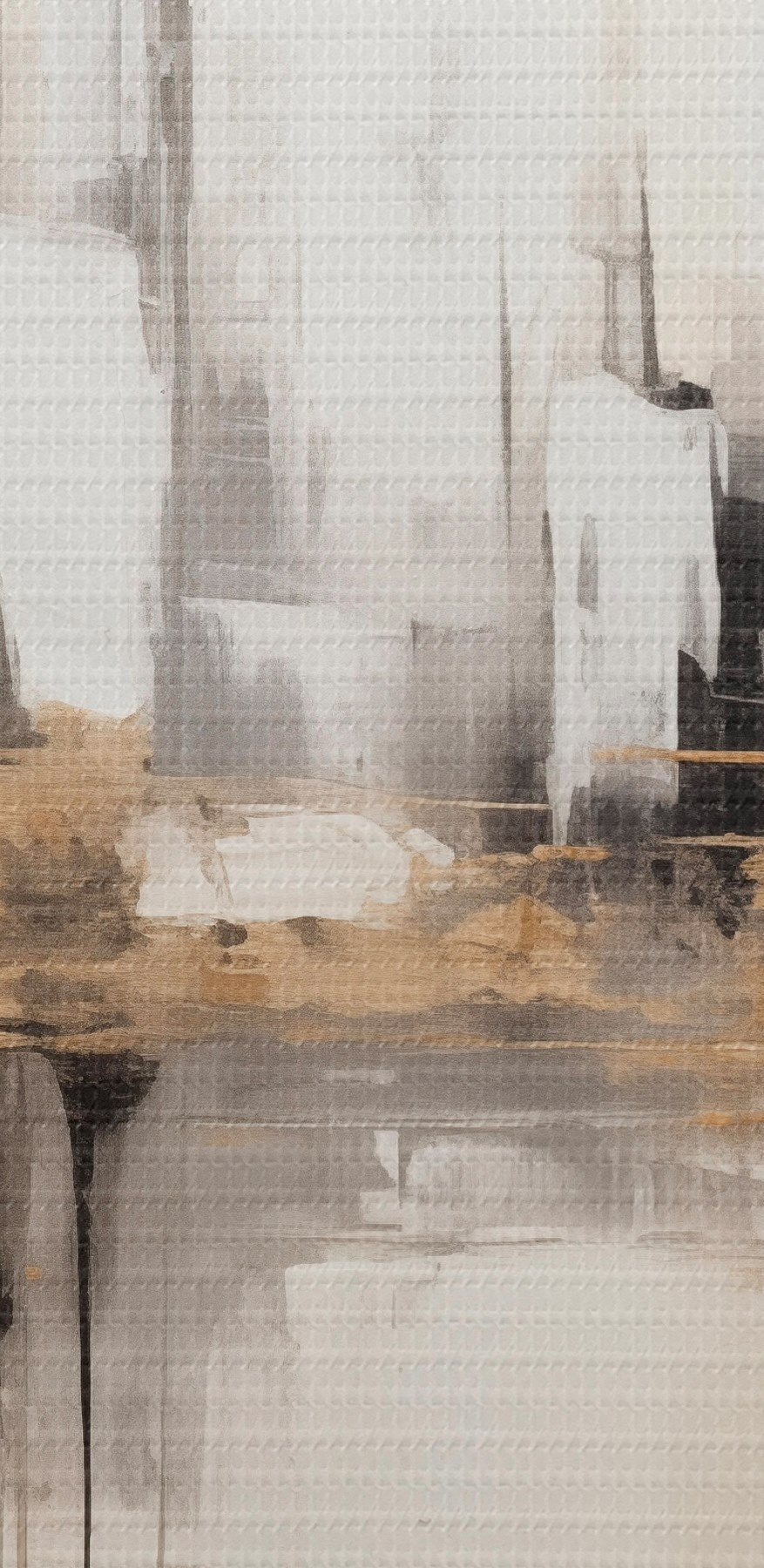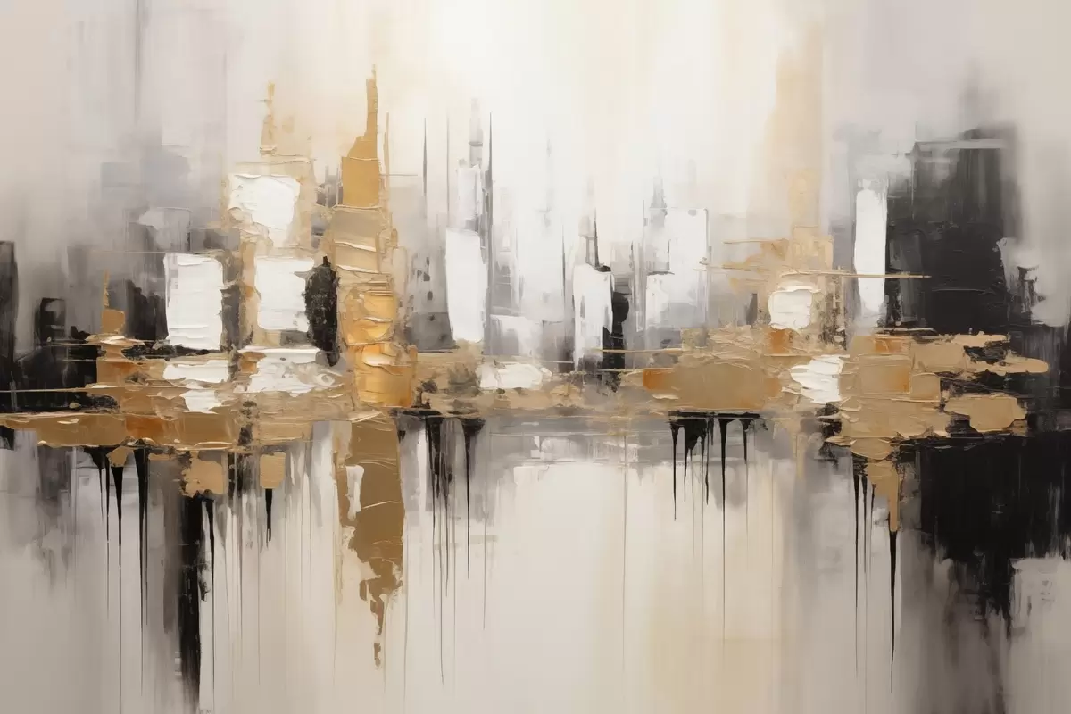 Paveikslas Abstraktus miesto peizažas su pastatų atspindžiais vandenyje, sukurtas neutraliais tonais su šiltų atspalvių akcentais. Nr s42628