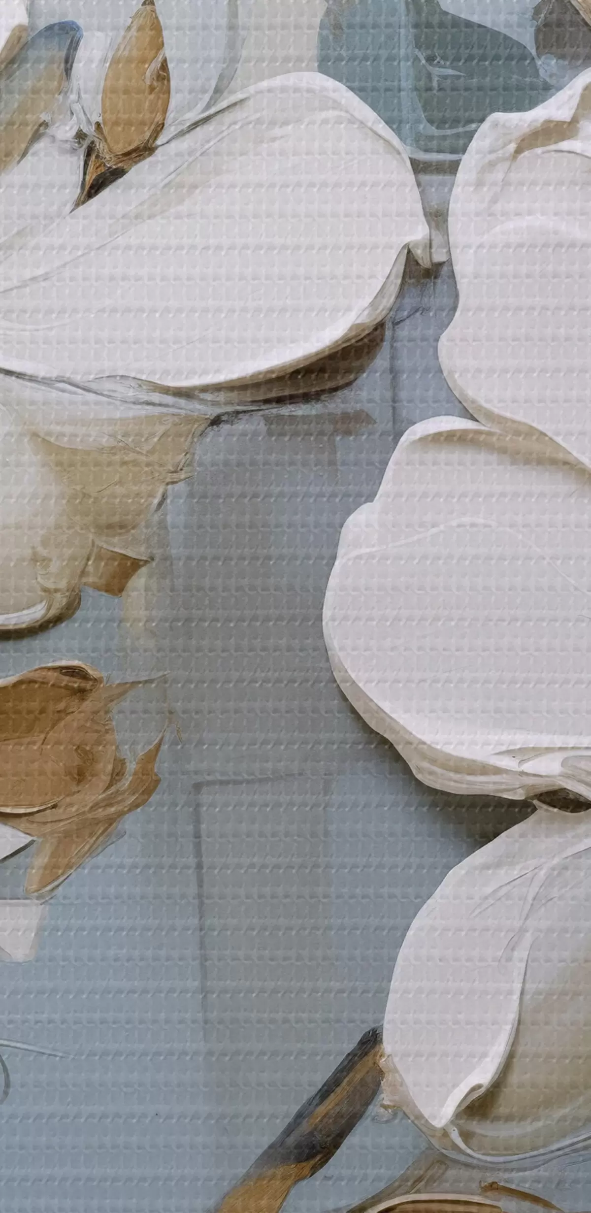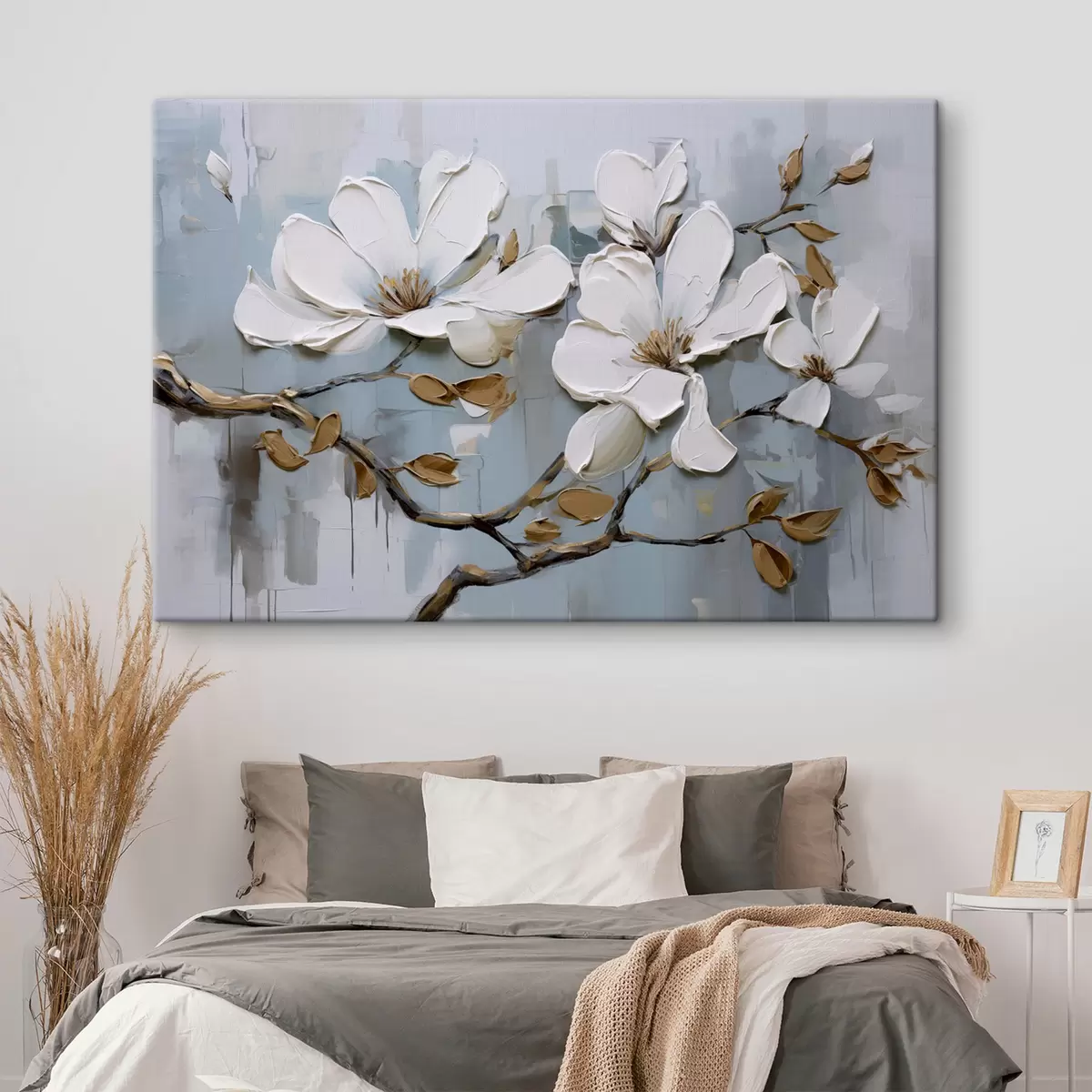 Paveikslas Baltos magnolijos žiedai su tekstūriniais žiedlapiais ir rudais lapais švelniai mėlyname fone aliejinės tapybos imitacija Nr s42711