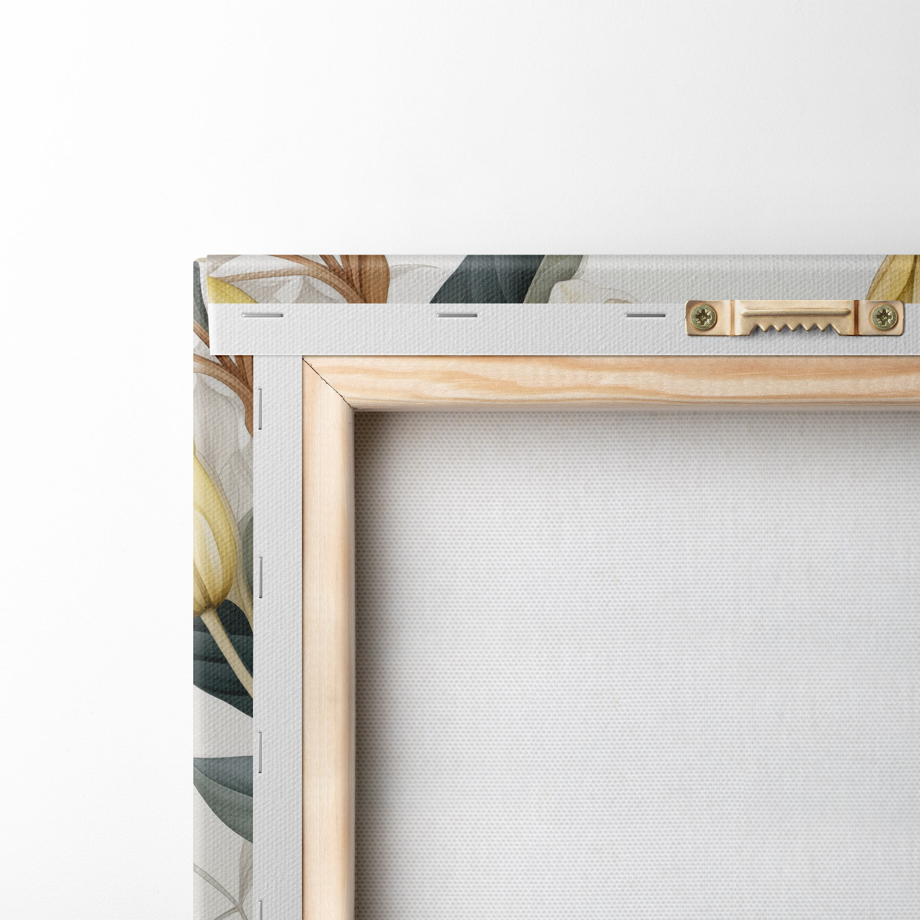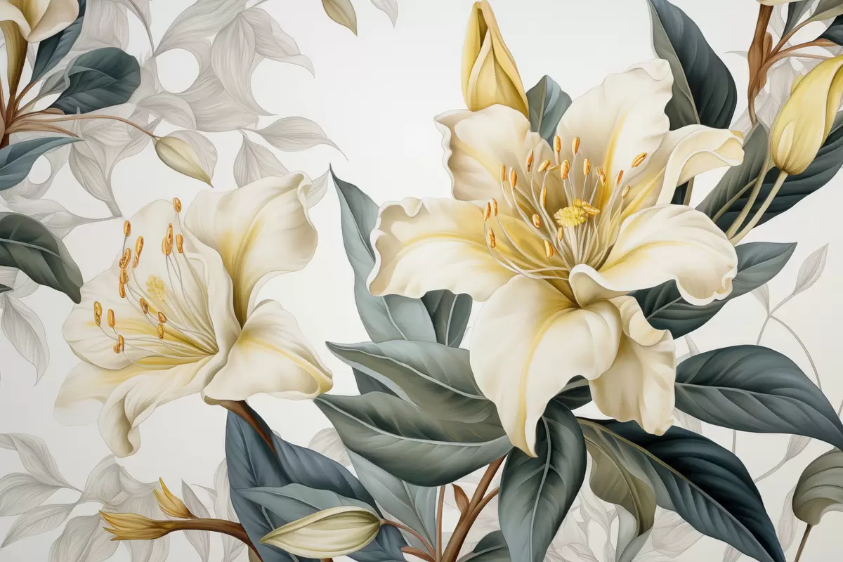 Paveikslas Botaninė iliustracija, vaizduojanti baltas ir šviesiai geltonas gėles su įmantriais žiedlapiais, apsuptas žalių lapų Nr s42712