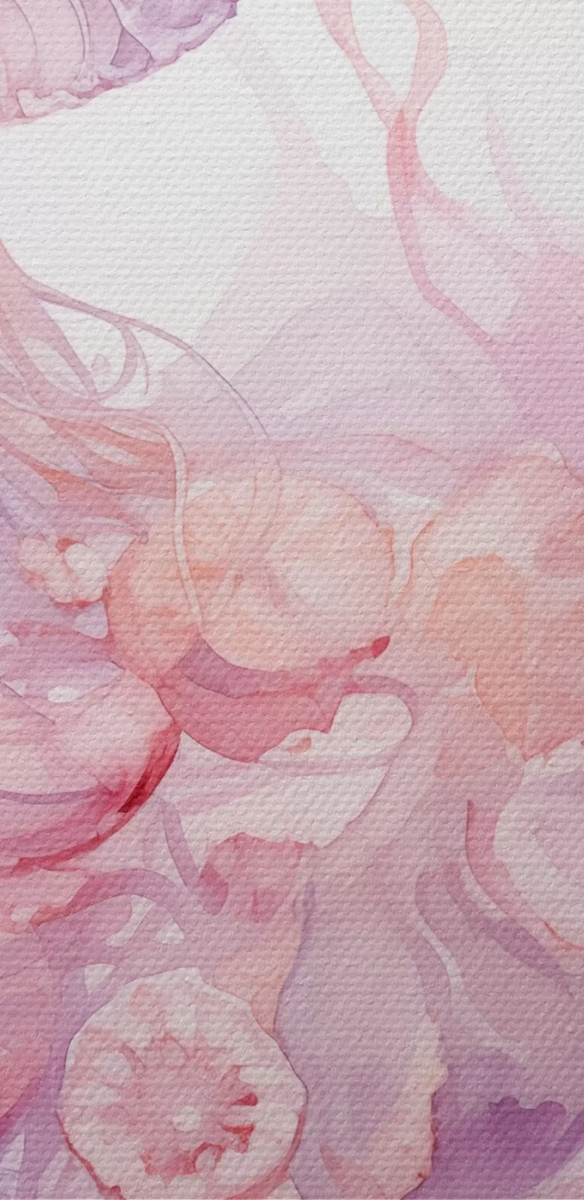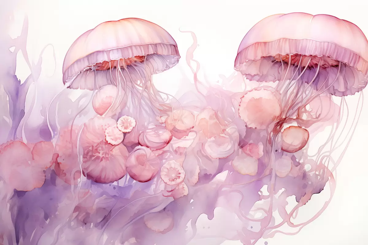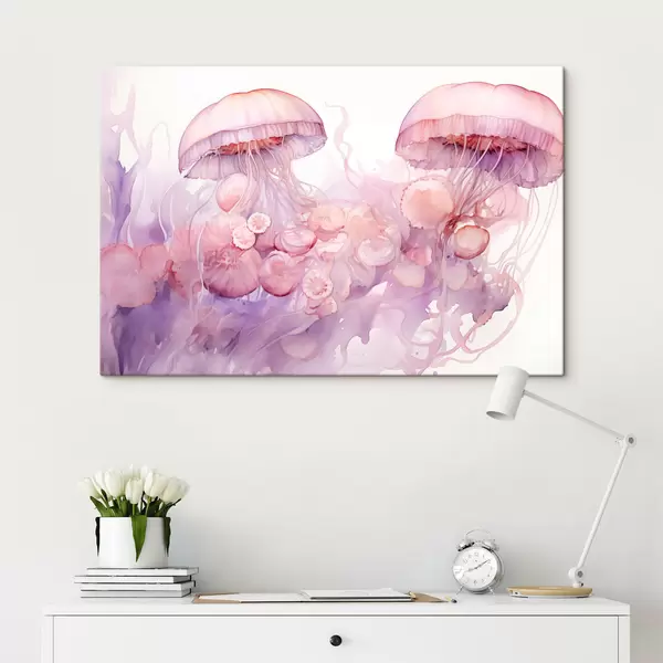 Paveikslas Rausvos medūzos, plaukiojančios švelnių rausvų ir violetinių atspalvių sūkuryje, apsuptos abstrakčių formų Nr s42730