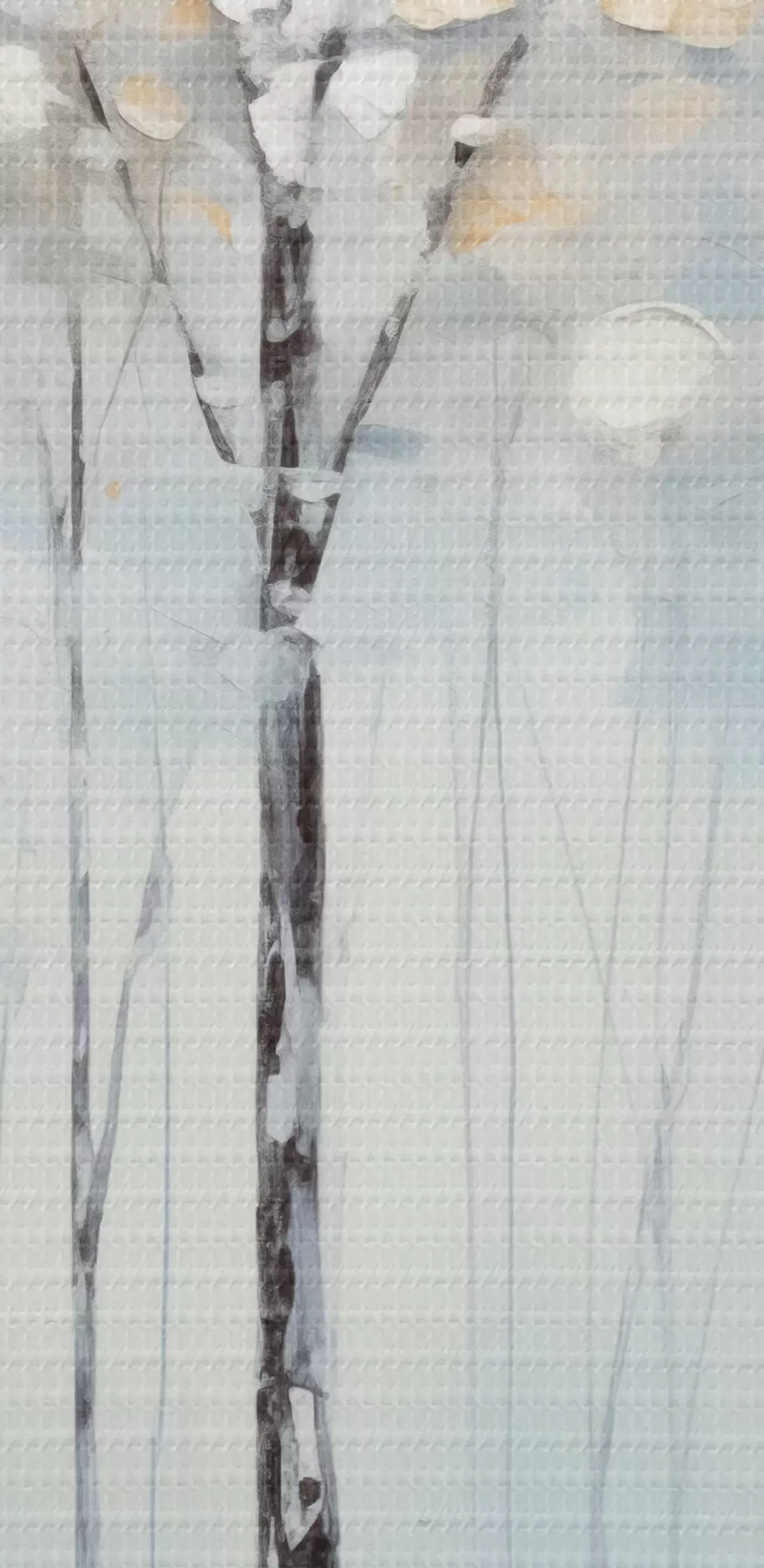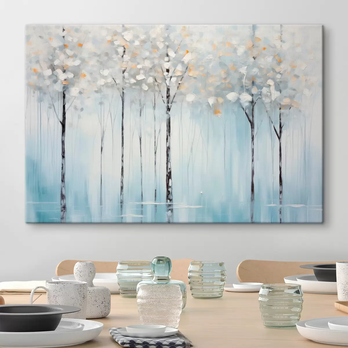 Paveikslas Aukšti, liekni medžiai su mėlynais lapais ir geltonais atspalviais švelniai mėlyname fone, aliejinės tapybos imitacija Nr s42731