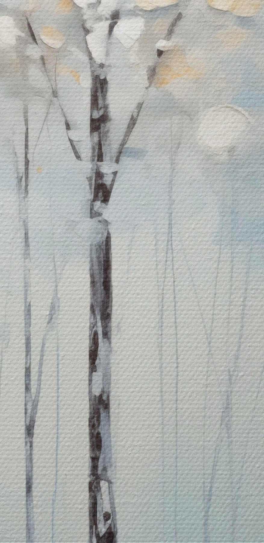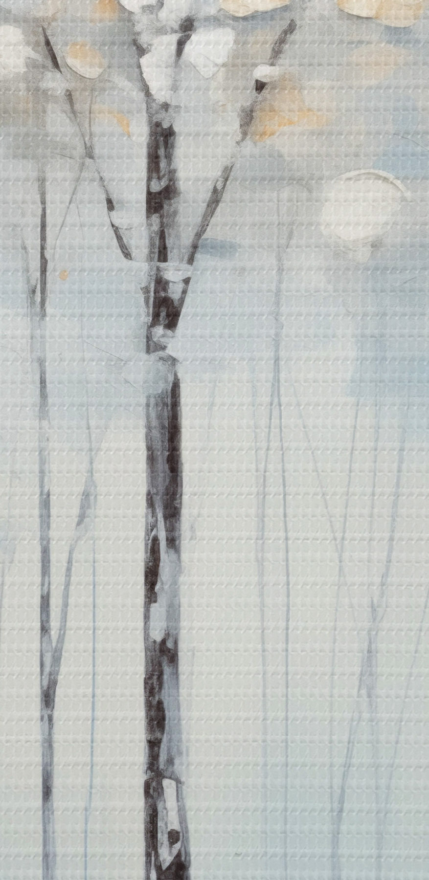 Paveikslas Aukšti, liekni medžiai su mėlynais lapais ir geltonais atspalviais švelniai mėlyname fone, aliejinės tapybos imitacija Nr s42731