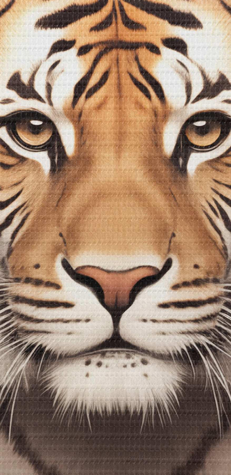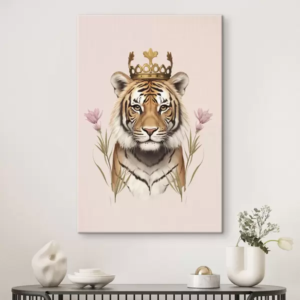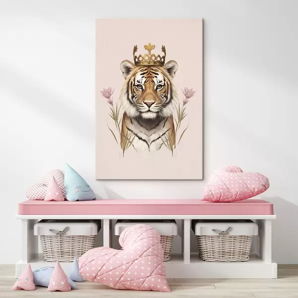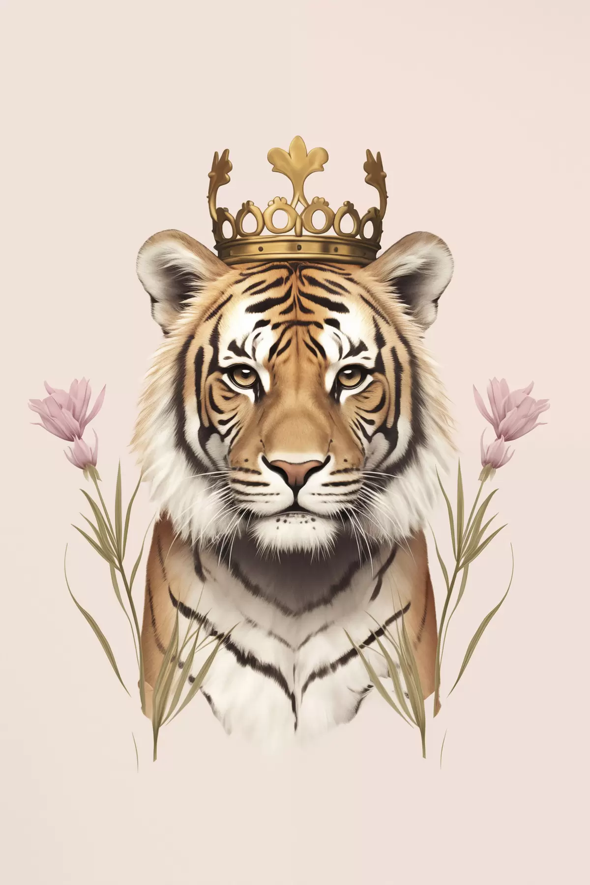 Paveikslas Tigras su auksine karūna, rožinis fonas, tulpių žiedai Nr s42782