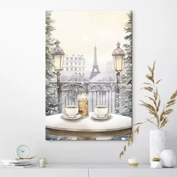 Paveikslas Graži kavinė Paryžiuje, arbatos puodeliai, romantiškas vaizdas, žiema, akvarelės stilius Nr s42799