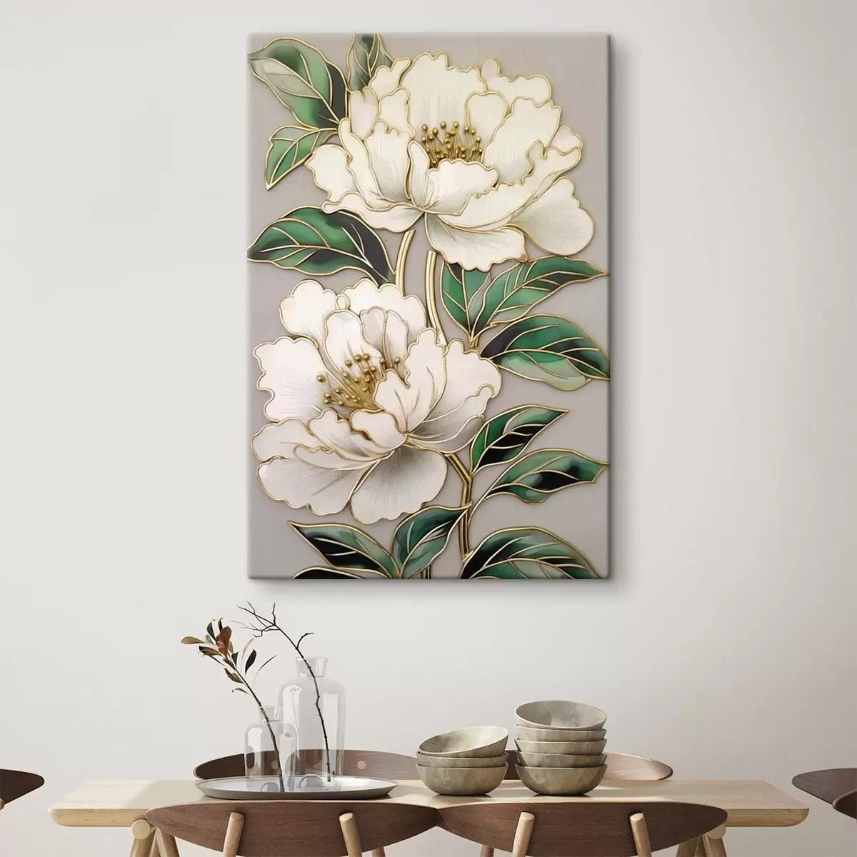 Paveikslas Baltos gėlės su žaliais lapais dekoratyvinėje kompozicijoje Nr s43011