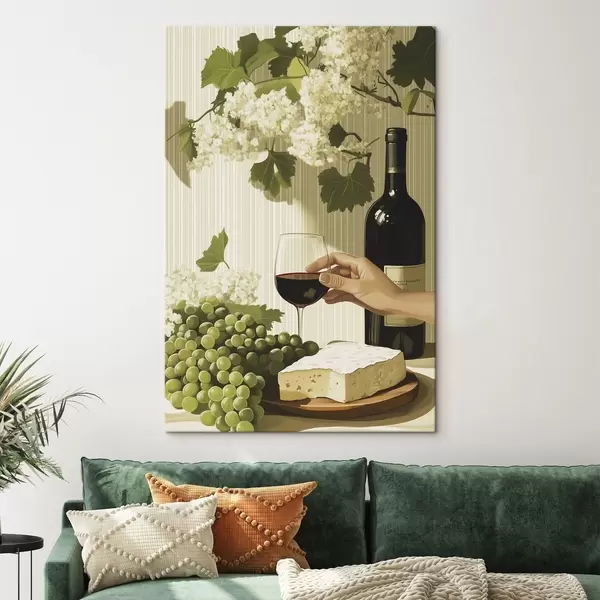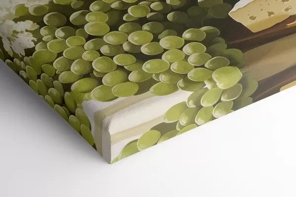 Paveikslas Vynuogės su sūriu, vyno butelis, vintažinis stilius, baltos gėlės Nr s43052