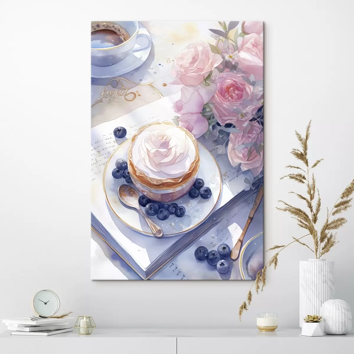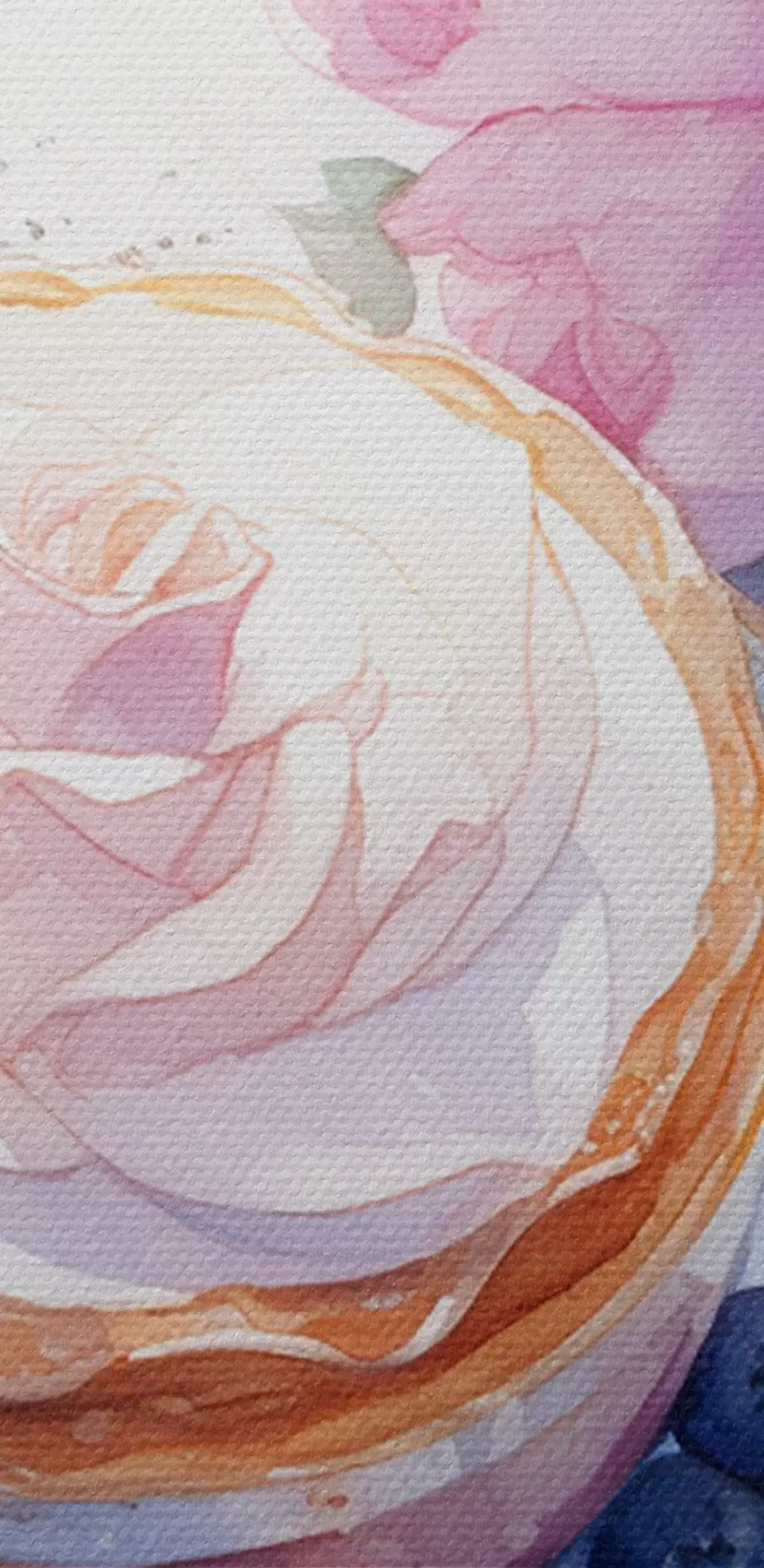 Paveikslas Mėlynių keksas, boho stilius, akvarelė, rožinės rožės, poetiškas Nr s43053