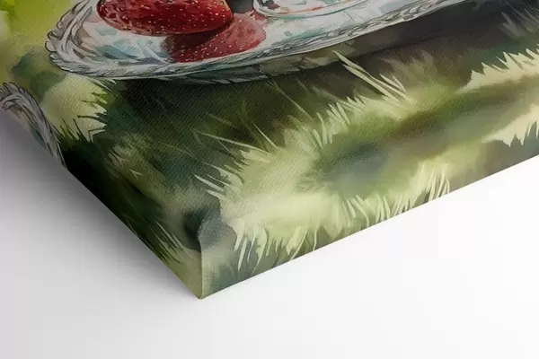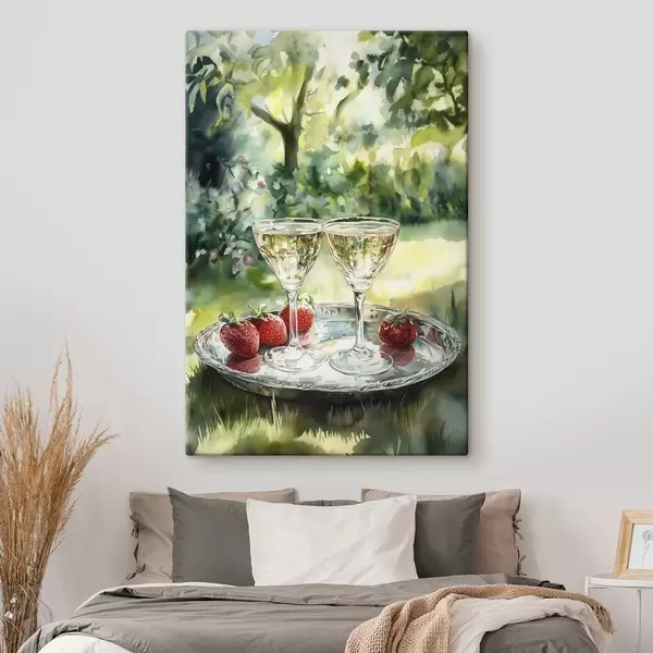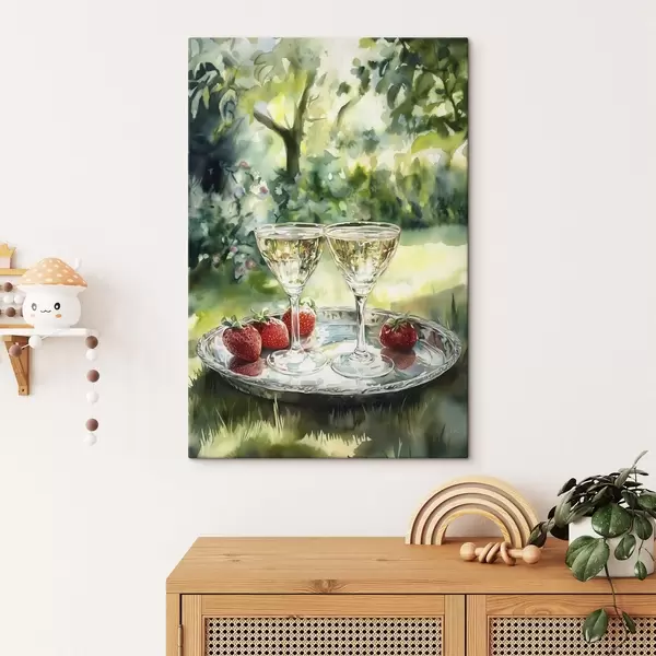 Paveikslas Vasaros piknikas su šampanu ir braškėmis, akvarelės stiliaus piešinys Nr s43055