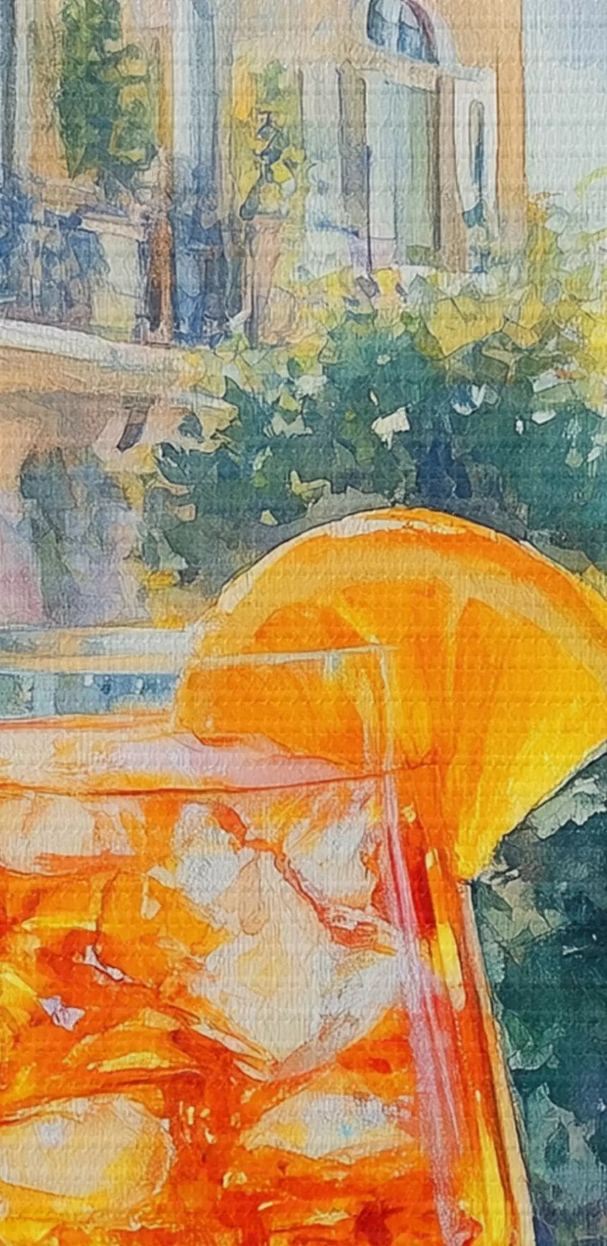 Paveikslas Kokteilis su apelsinais, akvarelės stilius, Italija, Aperol Spritz, architektūra, vasaros sodas Nr s43061
