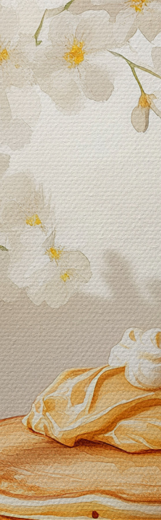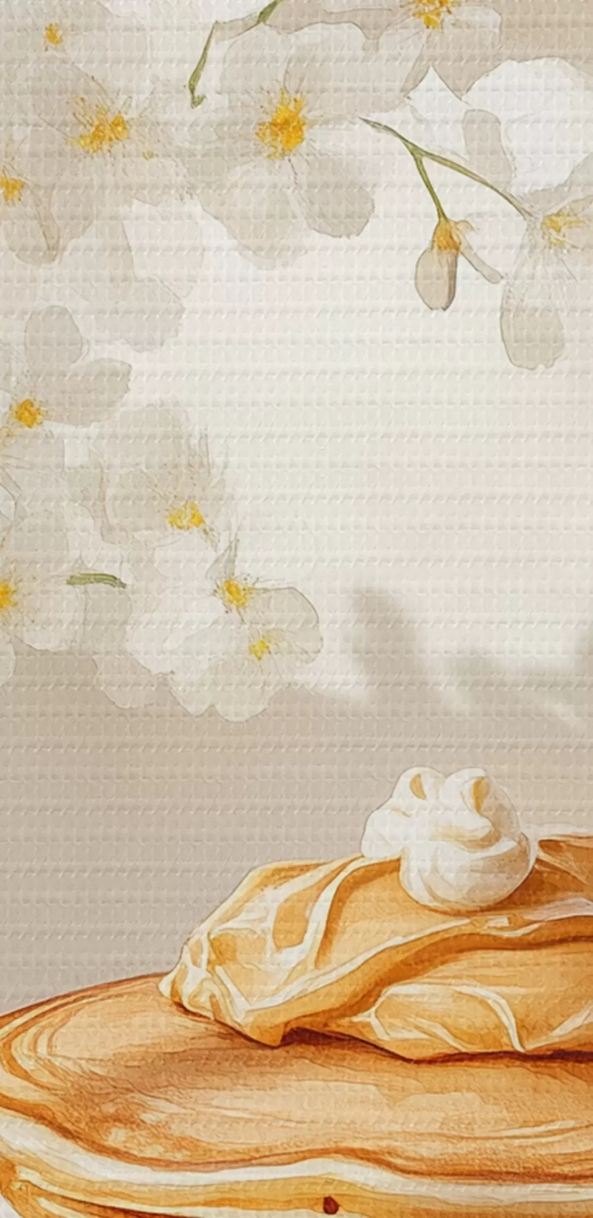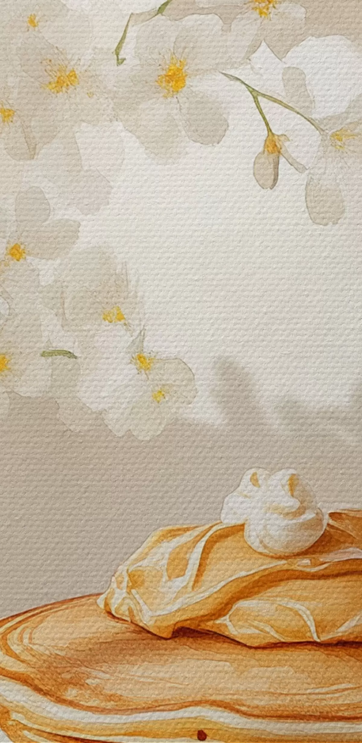 Paveikslas Skanūs blyneliai su žemės riešutų sviestu, akvarelės stilius, vaza su baltomis gėlėmis Nr s43063