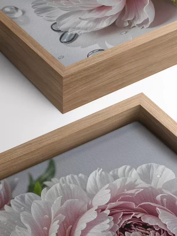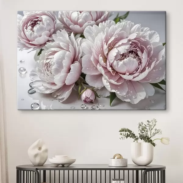 Paveikslas Šviesiai rausvi ir balti bijūnai su vandens lašeliais ant žiedlapių, fonas - baltas paviršius Nr s43158