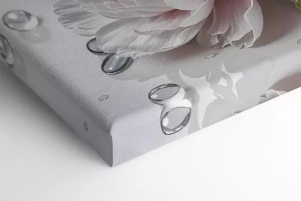 Paveikslas Šviesiai rausvi ir balti bijūnai su vandens lašeliais ant žiedlapių, fonas - baltas paviršius Nr s43158