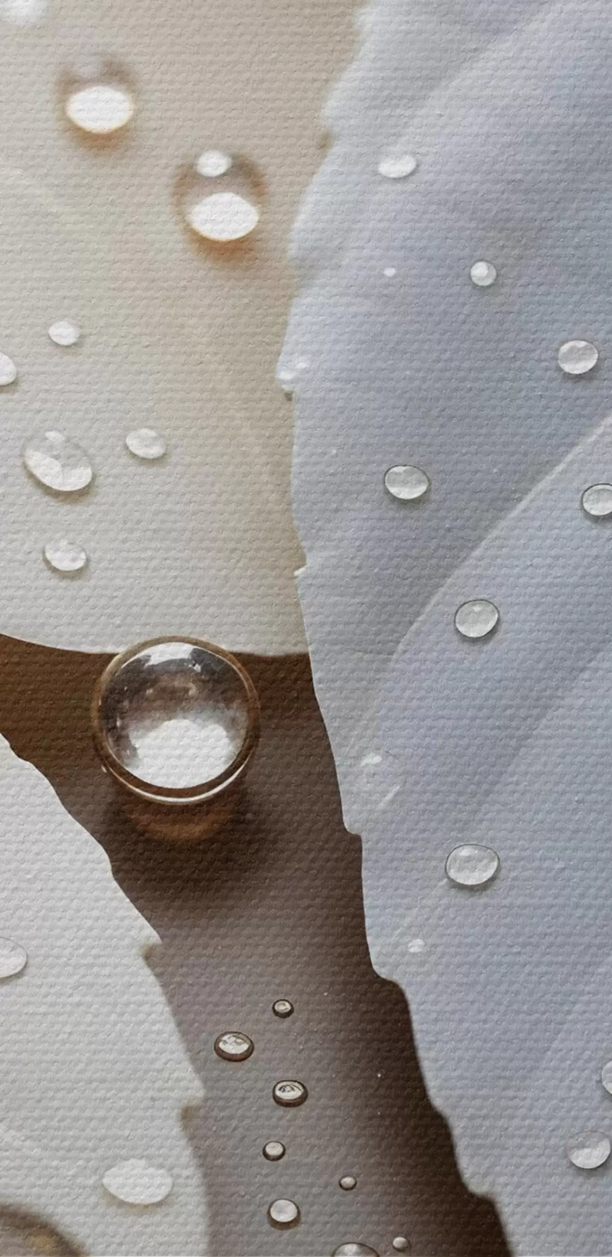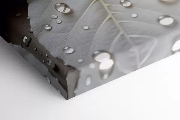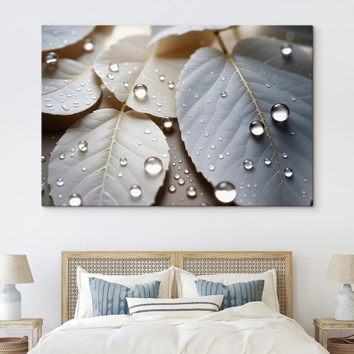 Paveikslas Vandens lašeliais padengti balti lapai stambiu planu, minimalistinė kompozicija, neutralus fonas Nr s43159