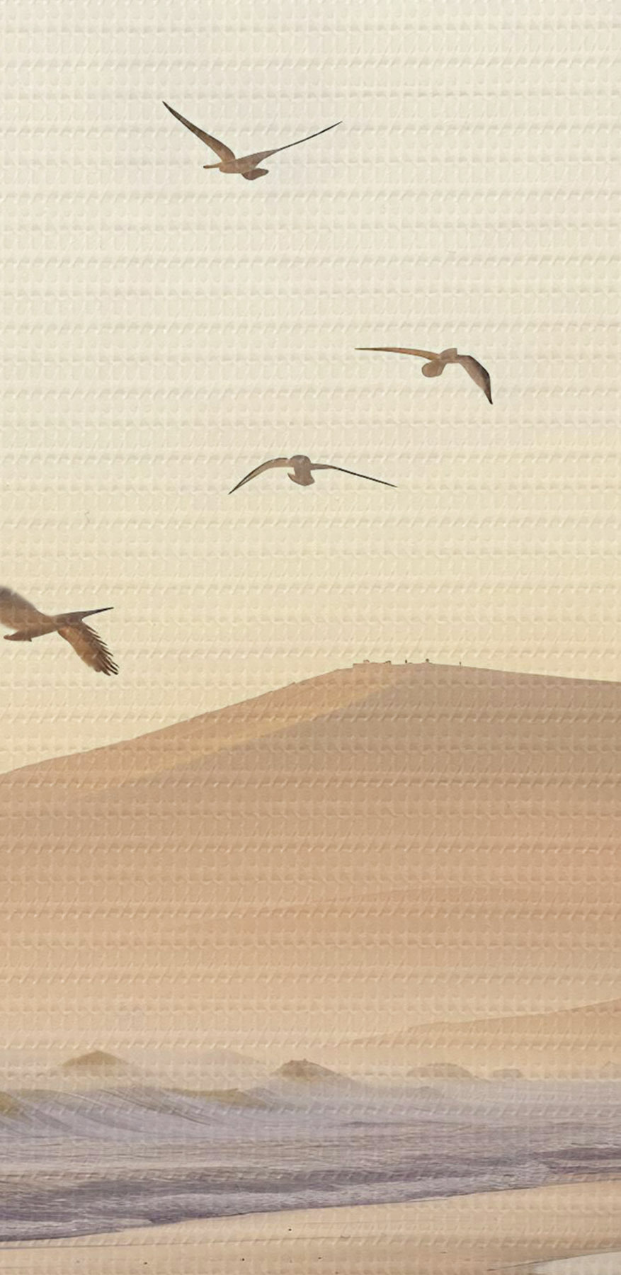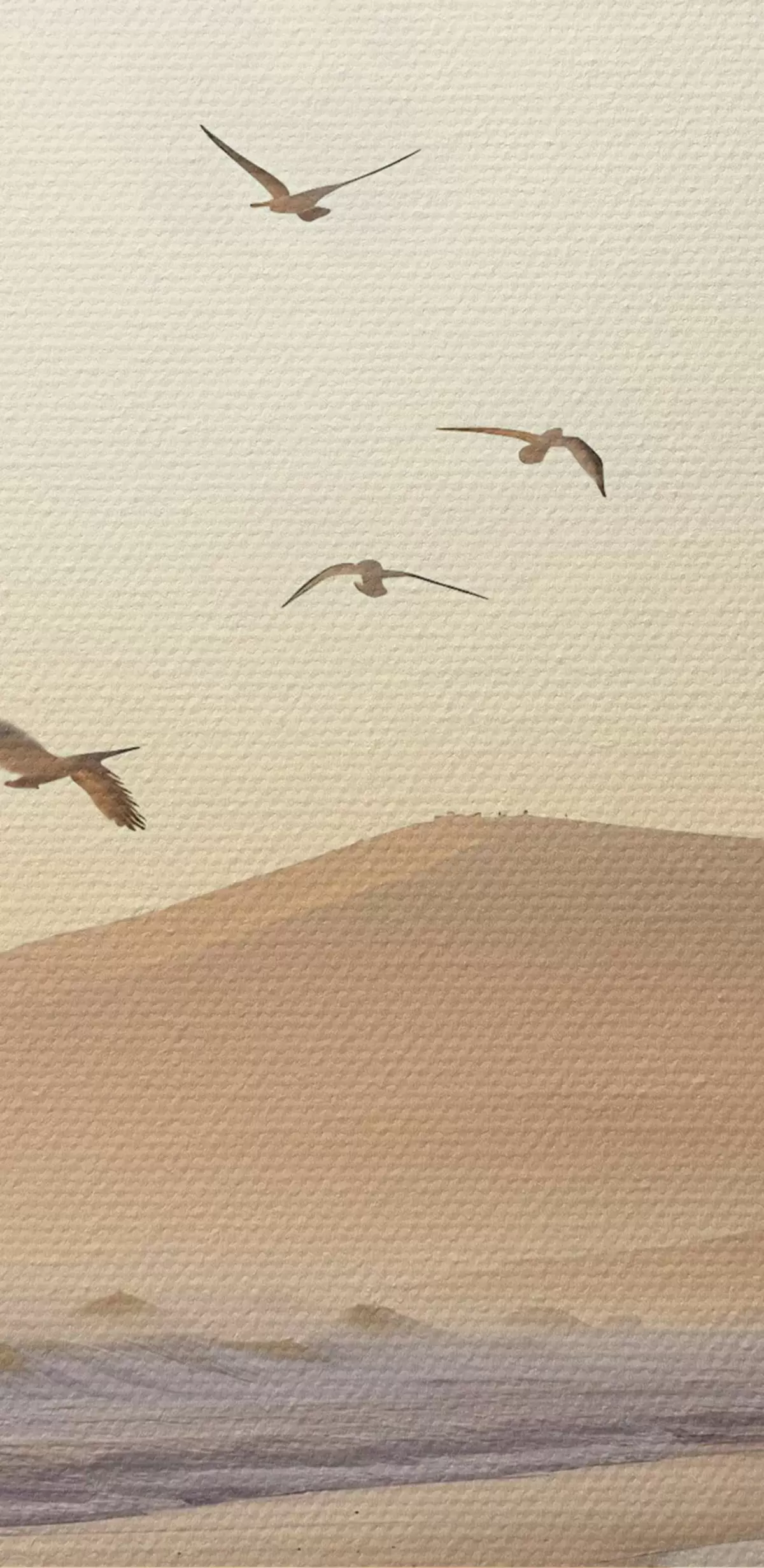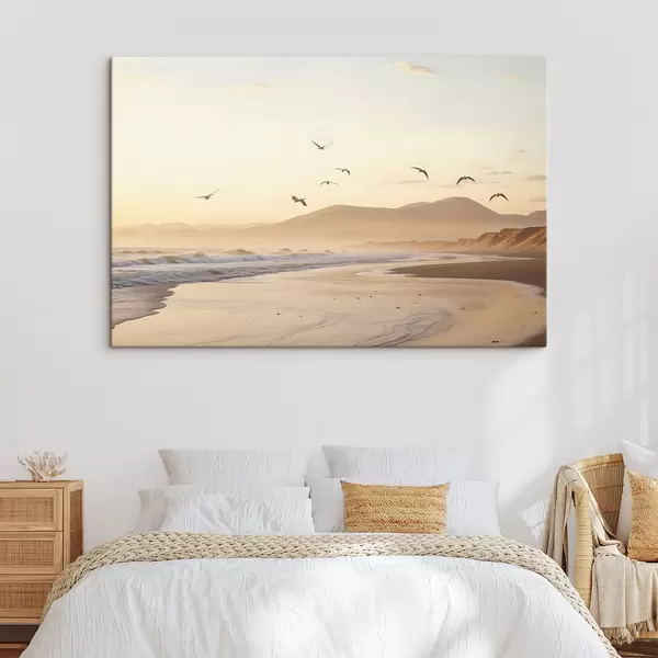 Paveikslas Paukščiai, skrendantys virš paplūdimio su vandenynu, kalnai fone, šiltos spalvos, minkšta pastelinė paletė Nr s43162